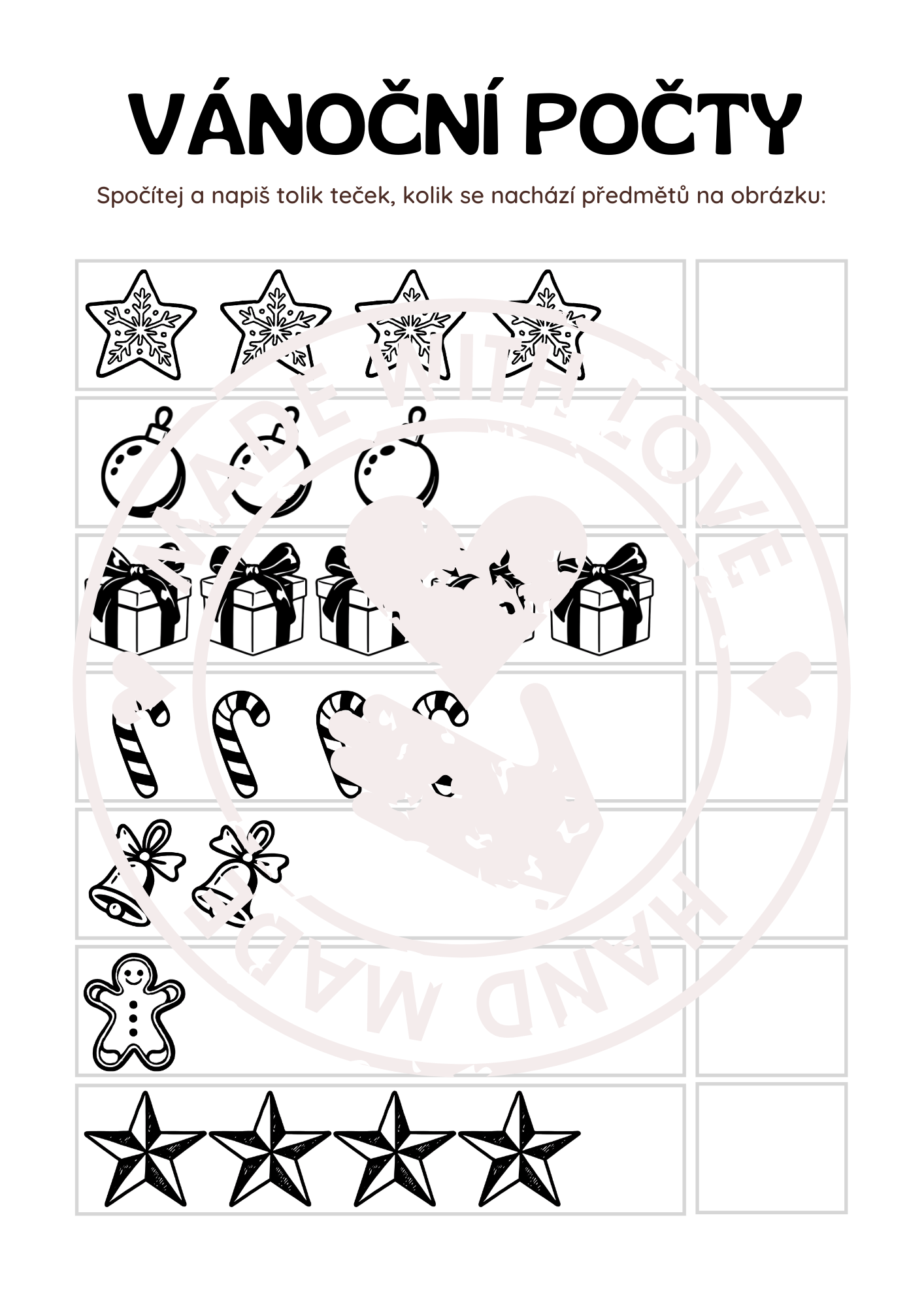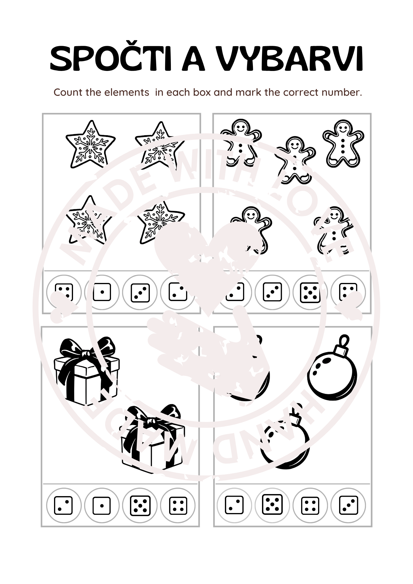 Děti počítají ozdoby, dárečky či zimní předměty a doplňují počet teček. Úkol podporuje rozvoj předmatematických představ, porozumění množství a pozorné zrakové vnímání.