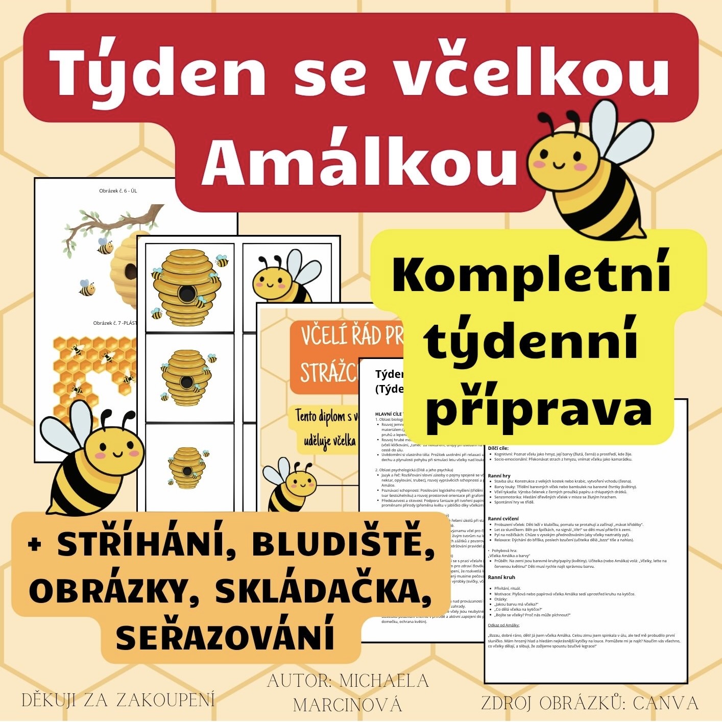 - Detailní týdenní plán: Kompletně rozepsané aktivity na každý den (pondělí–pátek), které tvoří ucelený příběh „Putování se včelkou Amálkou“.
