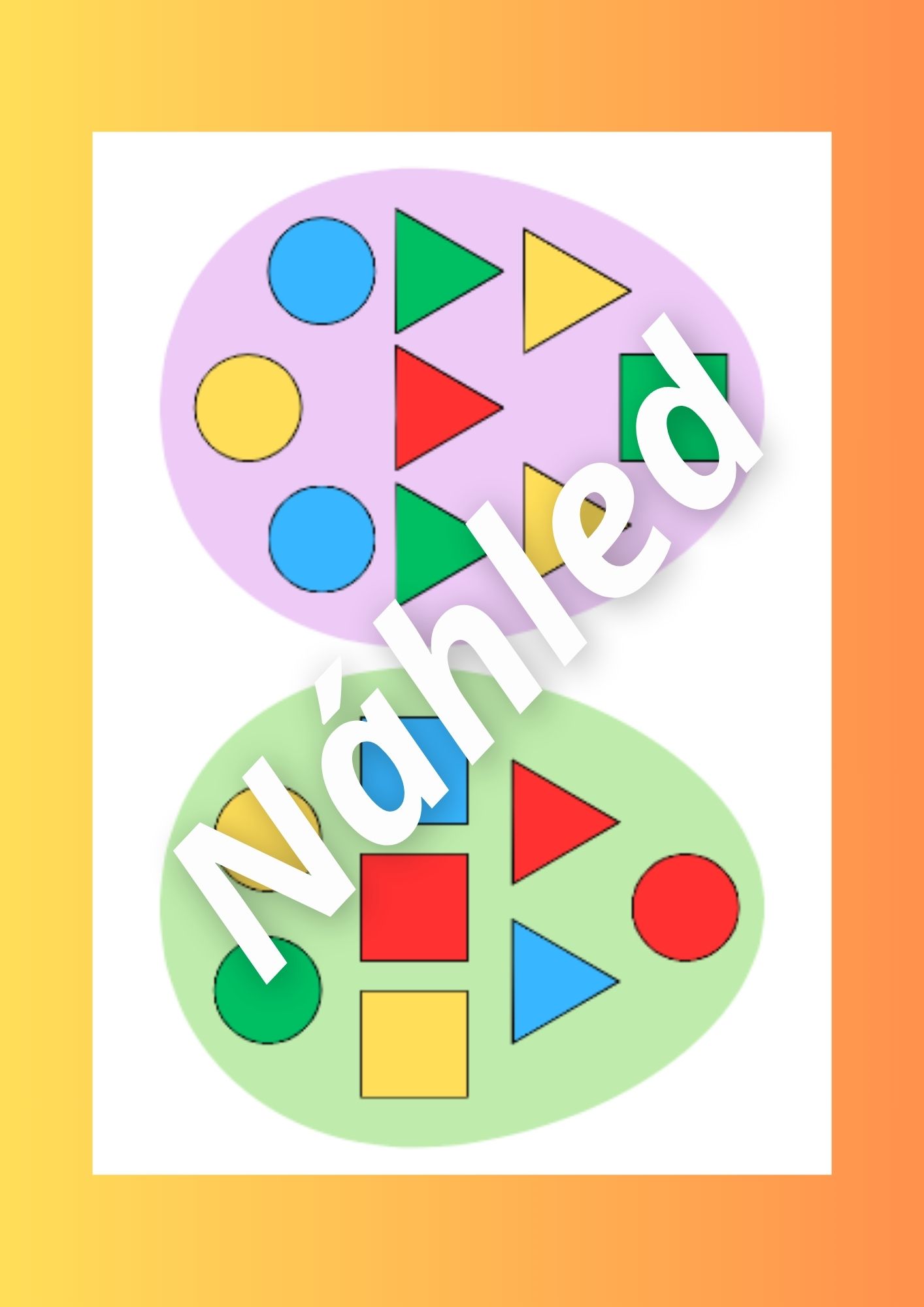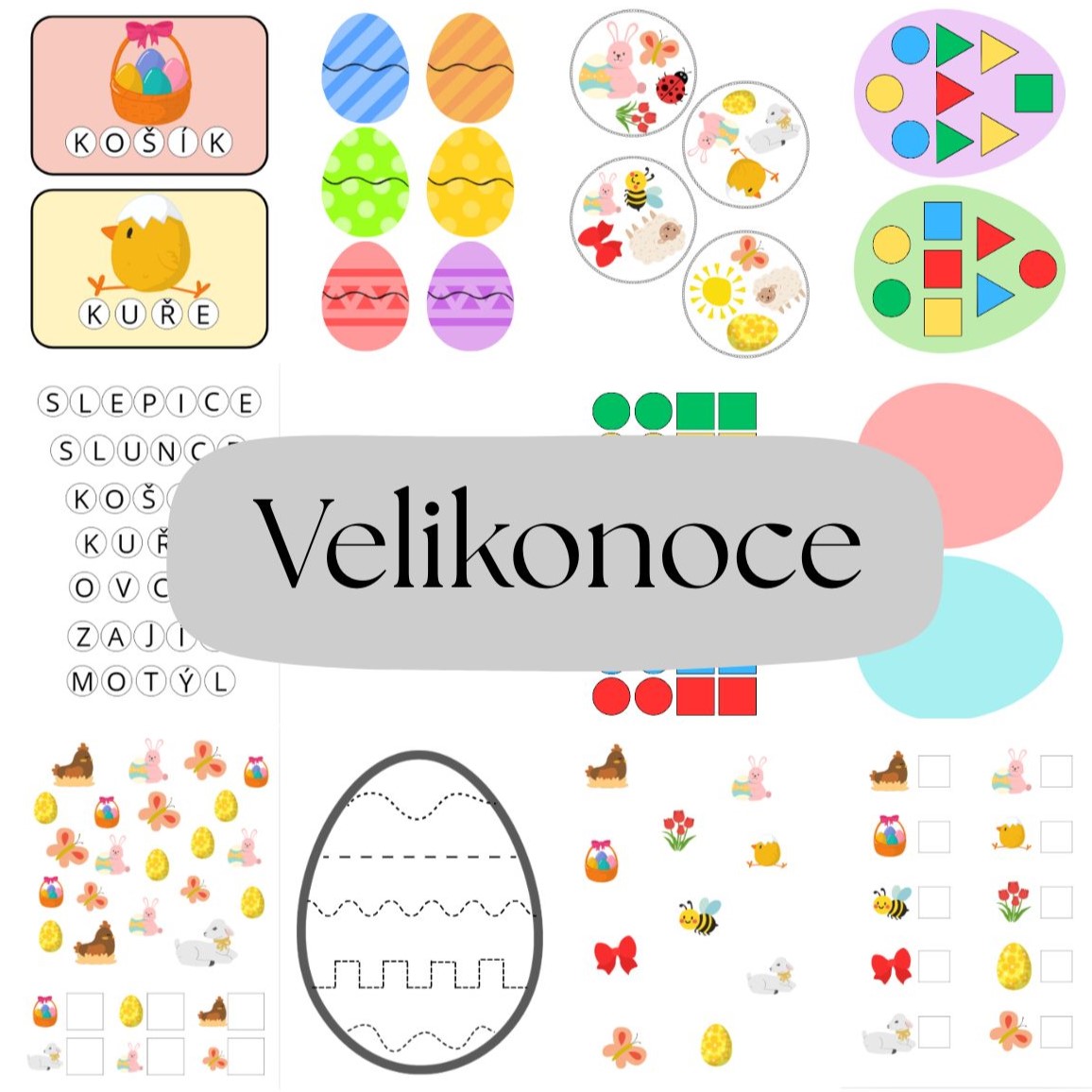 - Vajíčko s geometrickými tvary (str. 15-18)- rozstříháme všechny geometrické tvary. Děti je pak správně skládají na vajíčka.