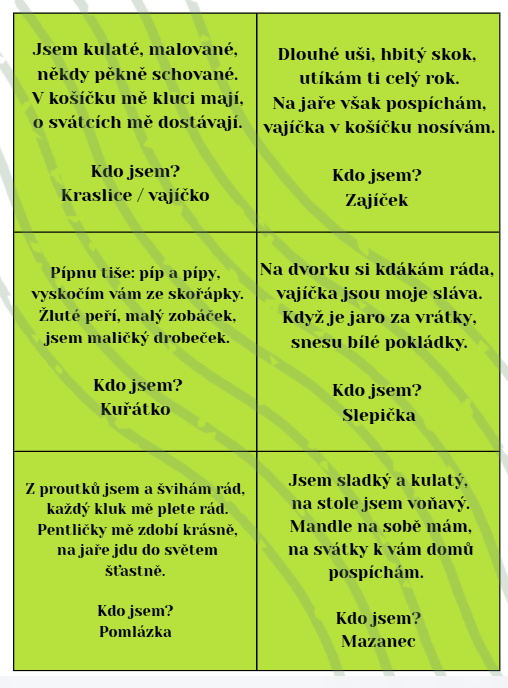 Novinka Kategorie produktu Velikonoce, svátky, Jarní tradice Jaro ostatní HÁDANKY, bludiště, labyrinty Prodávající: EliškaJetýlková Cena za ks: 55 Kč s DPH Popis Máte dotaz? Materiál obsahuje 12 hádanek a souvisejících obrázků na téma Velikonoce. You must have JavaScript enabled to use this form. Vaše jméno Váš e-mail Předmět Zpráva Odesláním formuláře souhlasím se zpracováním osobních údajů