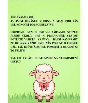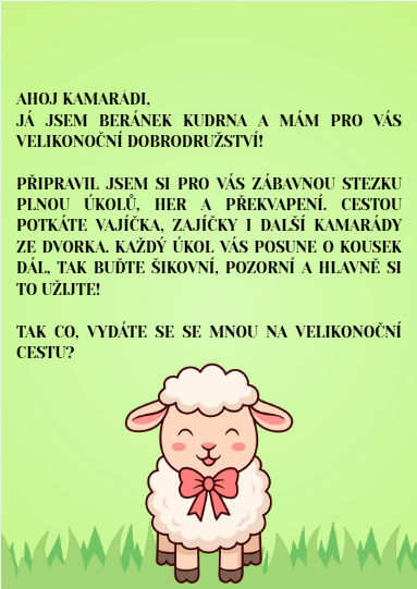 Materiál obsahuje stezku beránka Kudrny. Stezka má 10 rozmanitých úkolů, ve kterým si děti vyzkouší počítání, poznávání zvuků zvířat, hledání rozdílů, třídění podle barev, zpívání a spoustu dalších úkolů. K úkolům jsou i vytvořené potřebné přílohy.