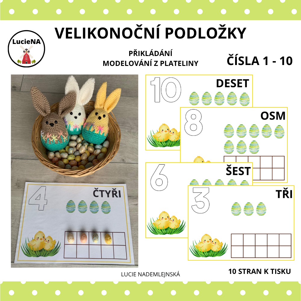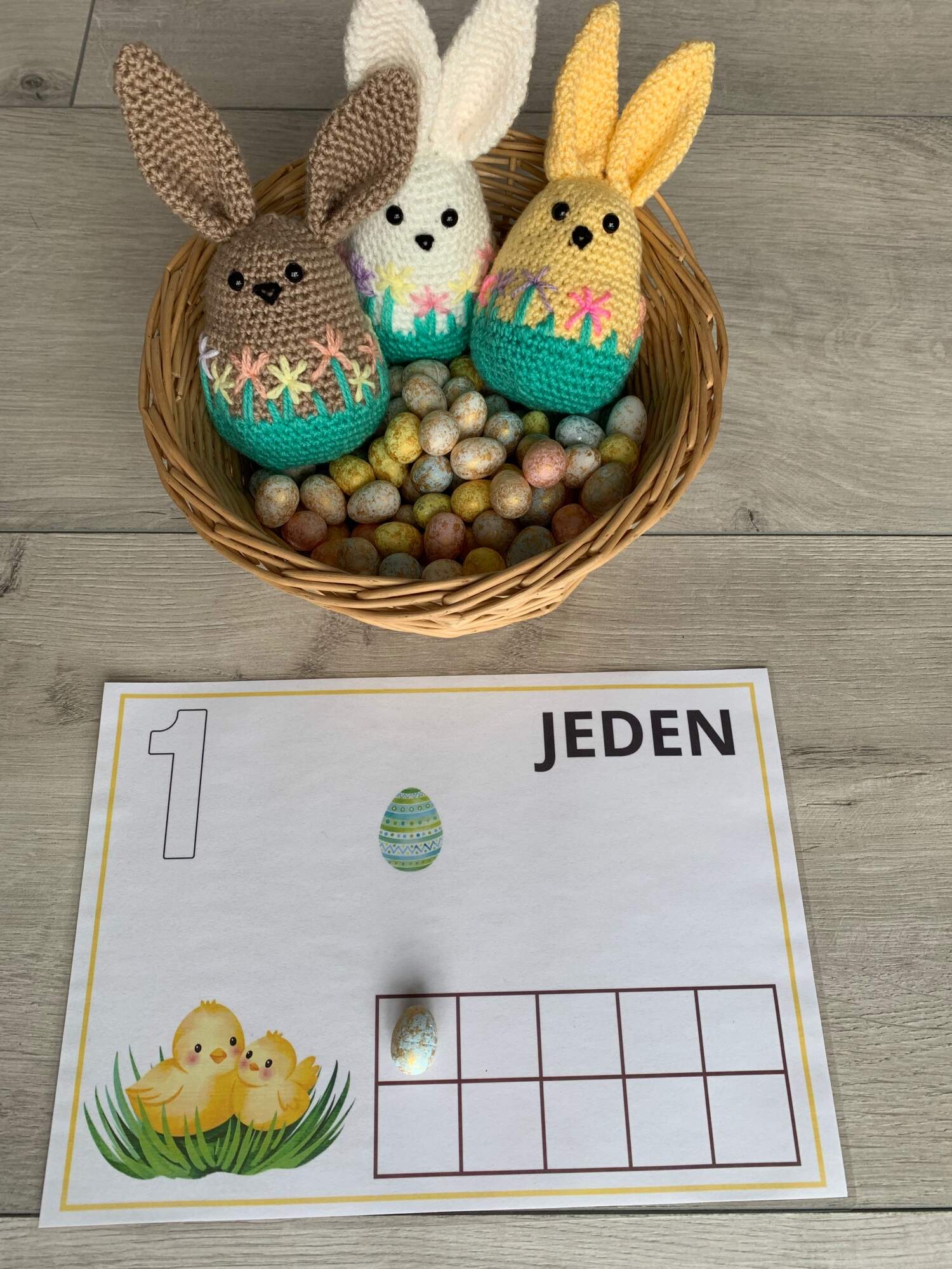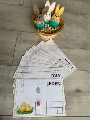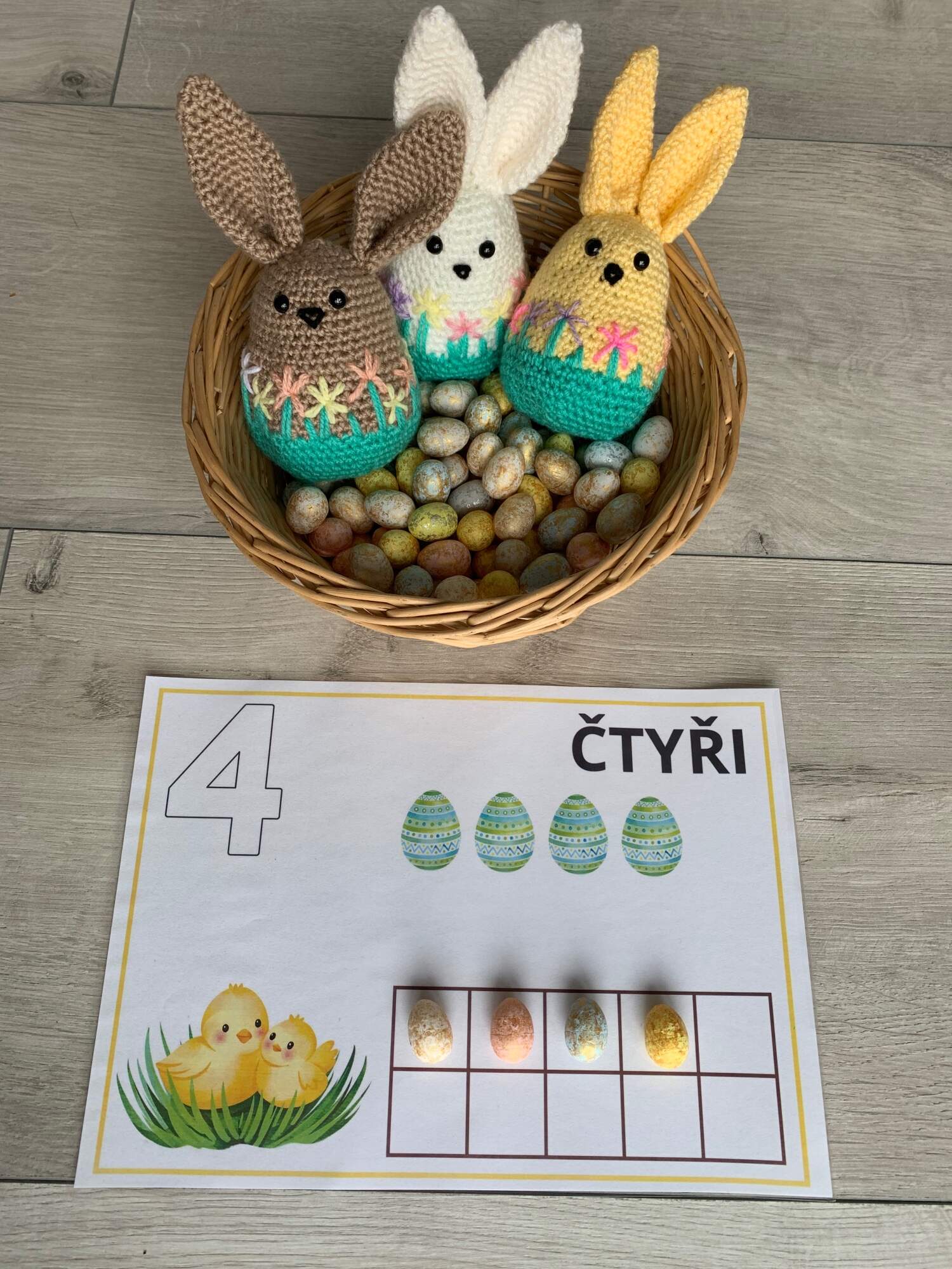 - úkolem dětí je přiložit příslušný počet např. korálků, pompomů, malých vajíček...