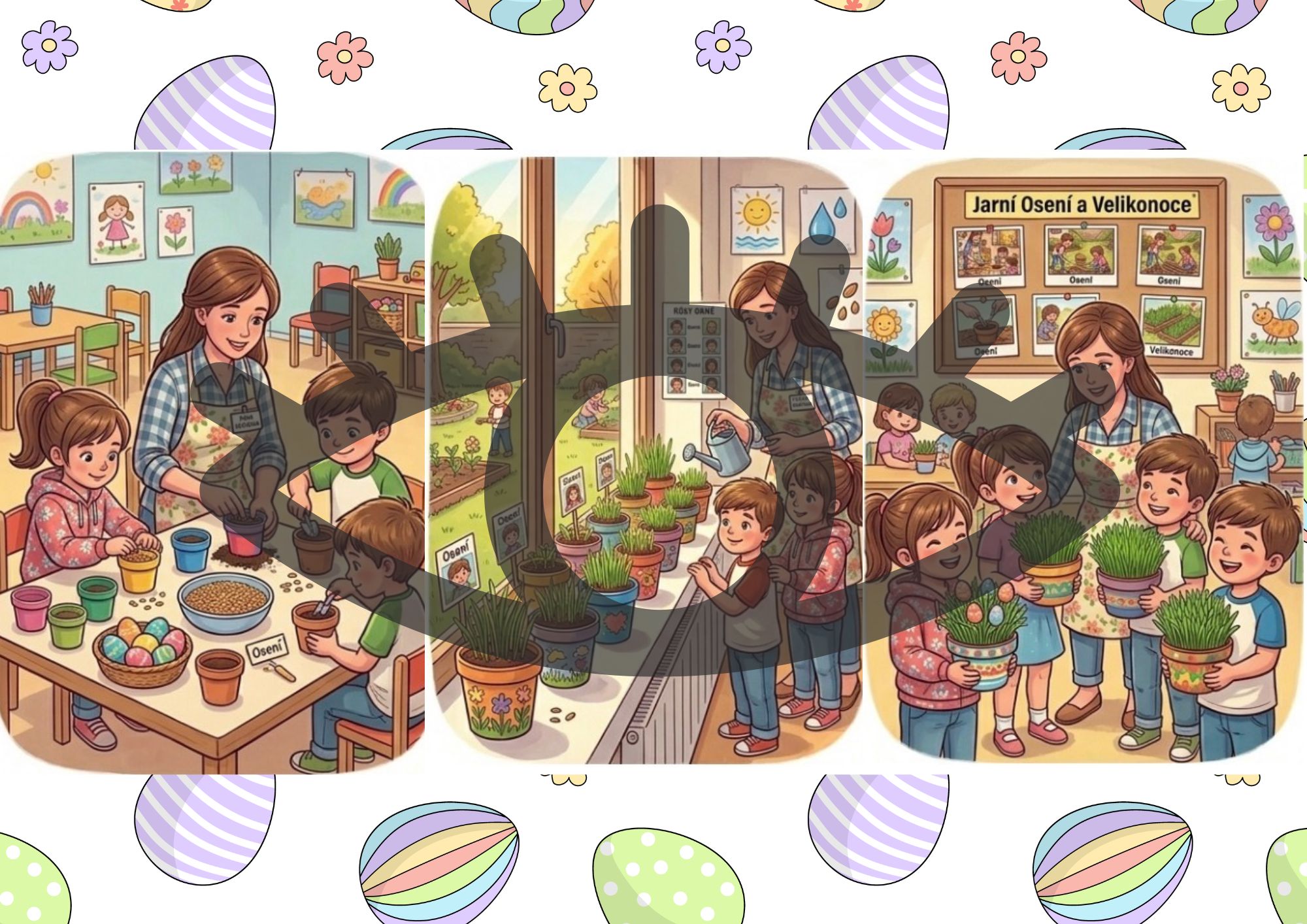 - Jarní tvoření a osení: Sázení semínek do květináčů, pozorování, jak rostou, a výroba věnců na dveře.