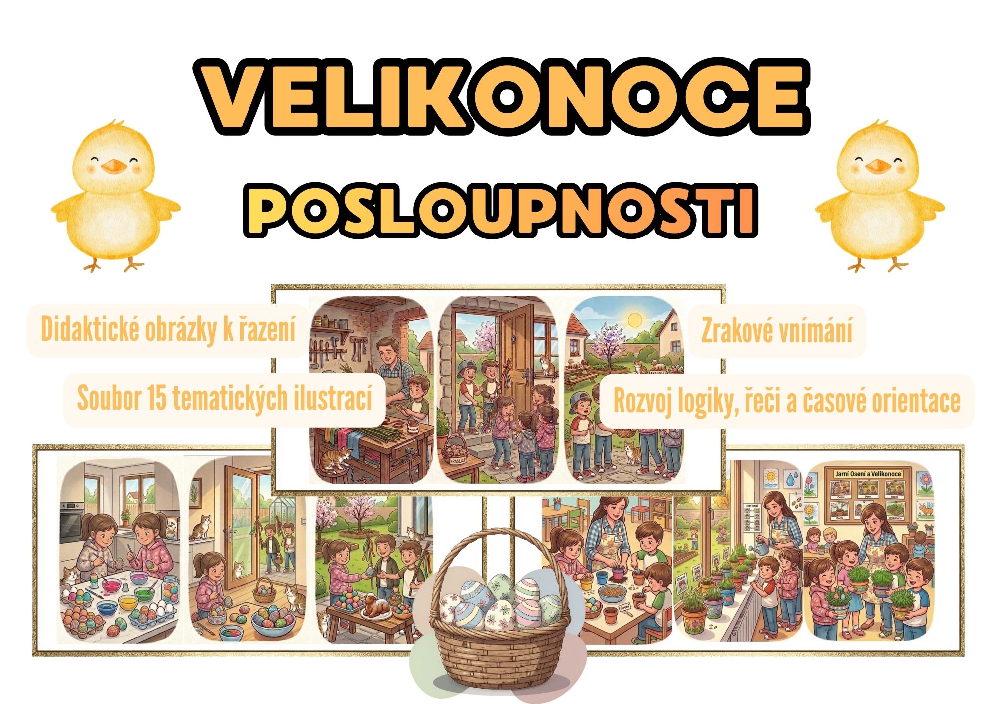 Tento soubor obsahuje 15 barevných didaktických karet, které dětem v mateřské škole přibližují české velikonoční tradice a jarní zvyky. Obrázky jsou rozděleny do 5 dějových řad (každá po 3 navazujících scénách), které pomáhají rozvíjet logické myšlení a časovou orientaci.