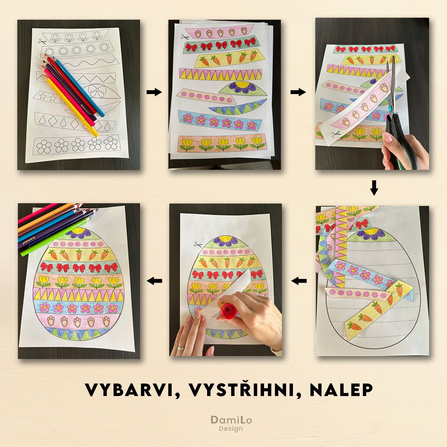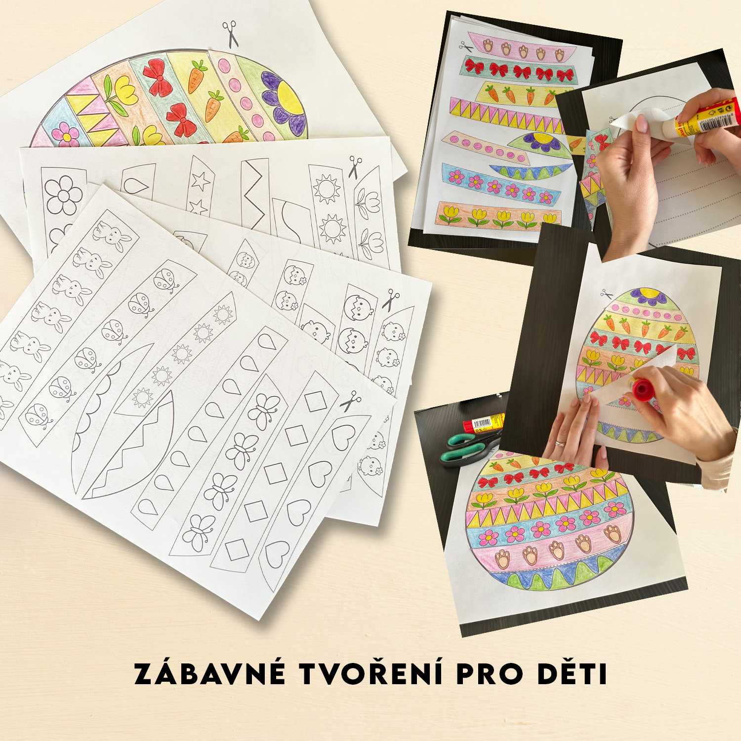 Sada velikonoční aktivity, při které děti vybarvují, stříhají a skládají vlastní vajíčko pomocí proužků.