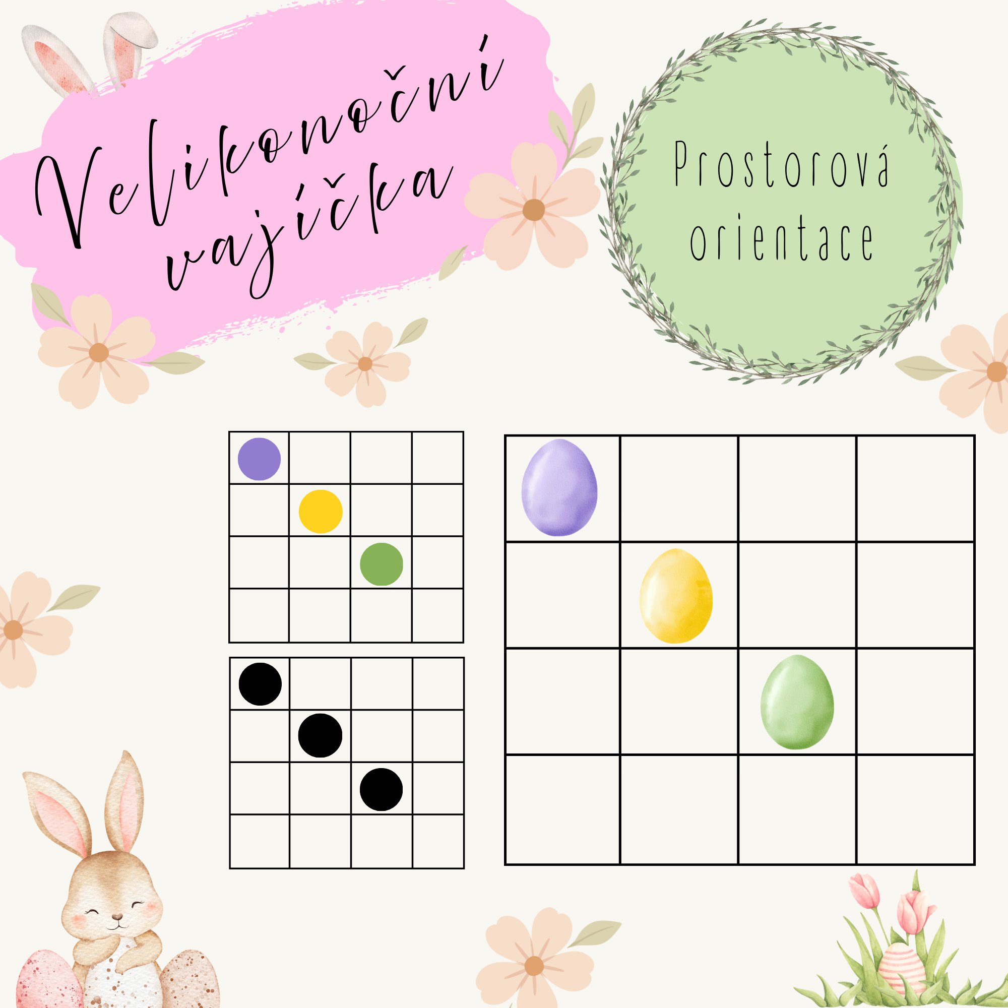 - předlohy, podle kterých má dítě za úkol správně umístit vajíčka do prázdné tabulky