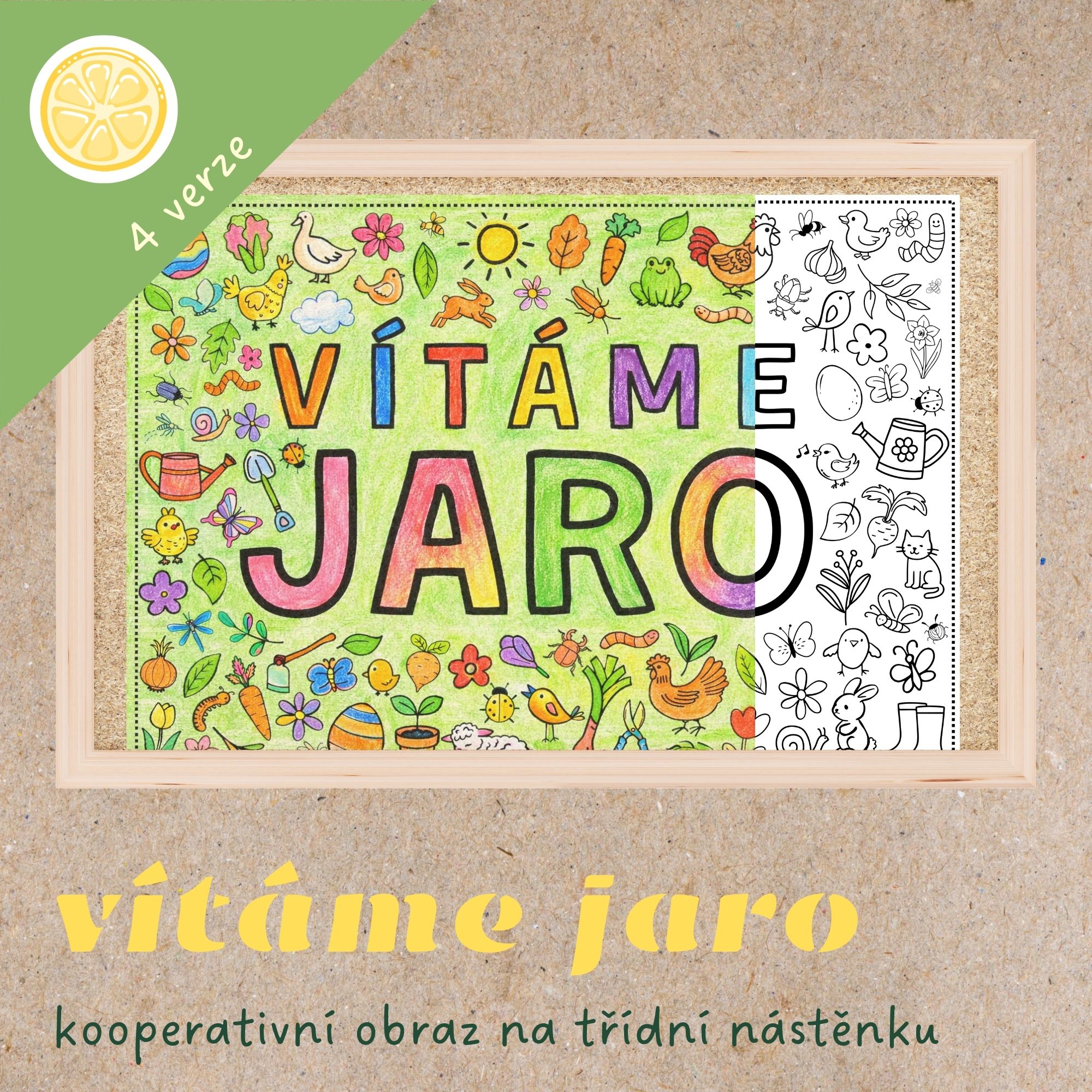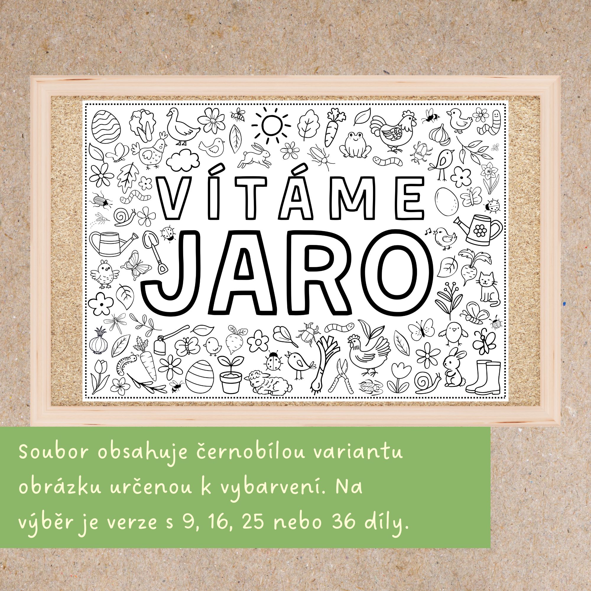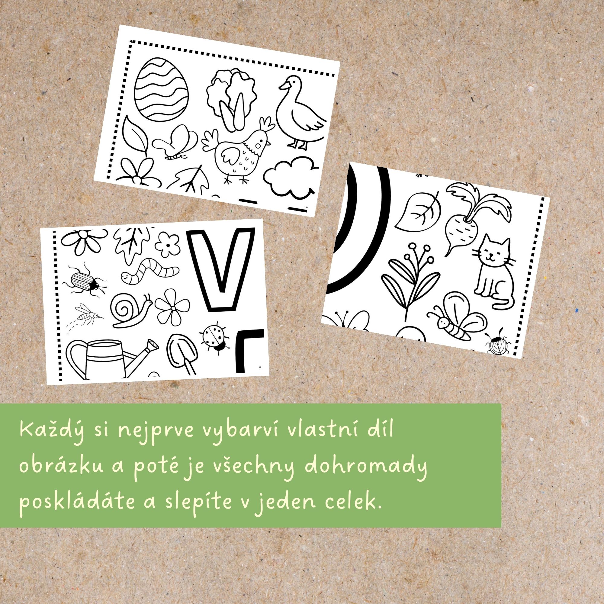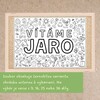 🌱Každý žák (nebo dvojice) dostane svůj arch k vymalování. Když je hotovo, archy se přiloží k sobě, slepí a odhalí nápis: VÍTÁME JARO. Společný obraz na nástěnku je hotov. Najdete na něm jarní motivy všeho druhu: jarní květiny, mláďata, zeleninu, hmyz a další výjevy ze zahrádky.