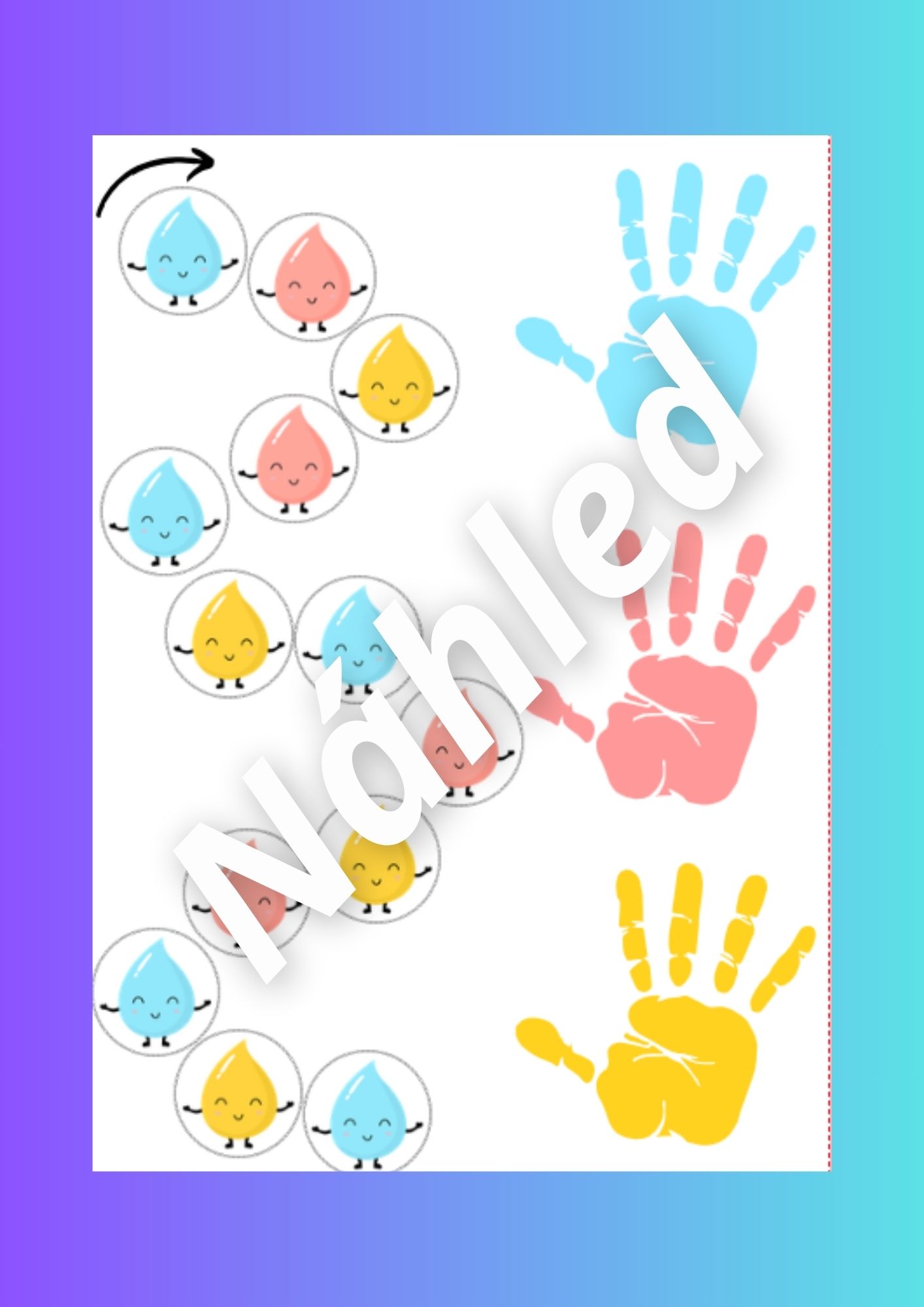 - Propojení hemisfér - kapičky (str. 23) - dítě jedním prstem ukazuje na kapky a druhou rukou podle barvy kapky přikládá dlaň na odpovídající barevný otisk