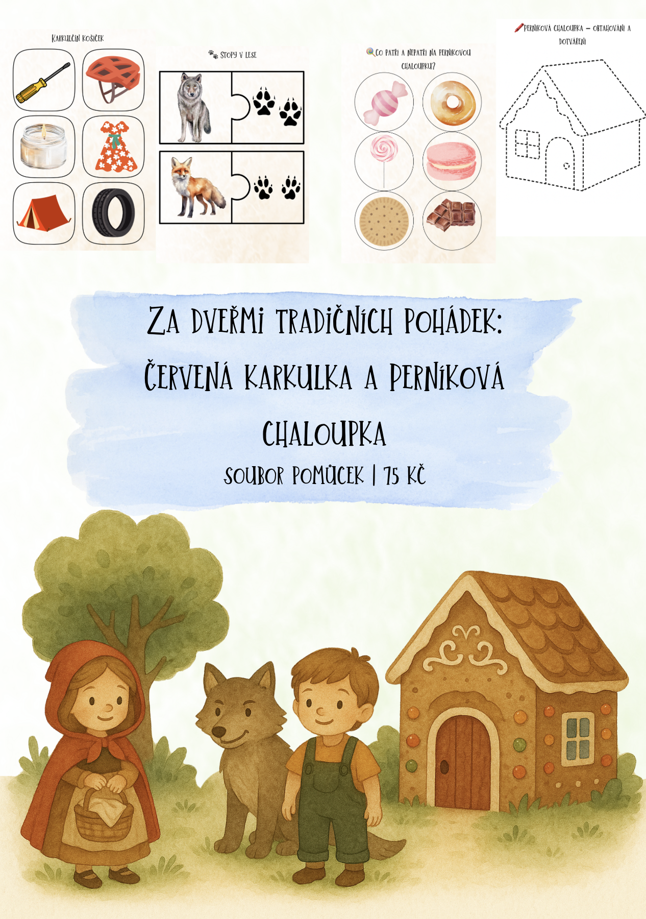 Tematický soubor, který dětem přiblíží dvě známé pohádky – Červenou Karkulku a Perníkovou chaloupku – pomocí hravých a rozvíjejících aktivit. Každá aktivita obsahuje popis, návod k použití a vzdělávací cíle dle RVP PV. Materiál podporuje zrakové vnímání, jazykové dovednosti, třídění, počítání, tvoření i samostatnost.