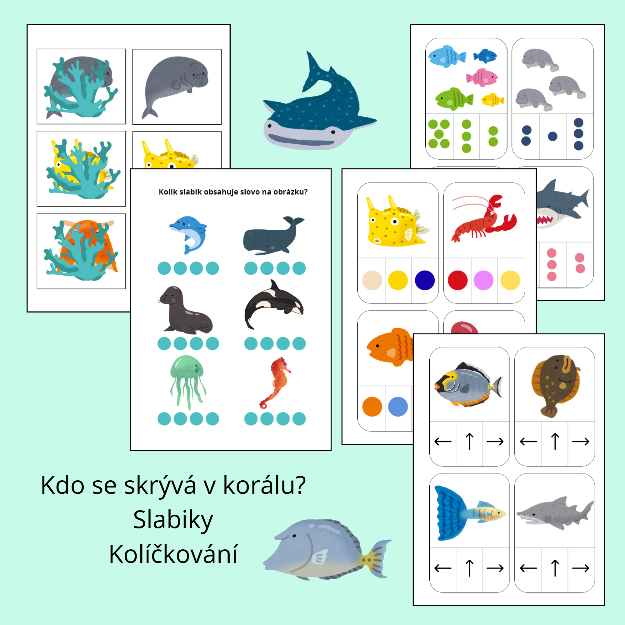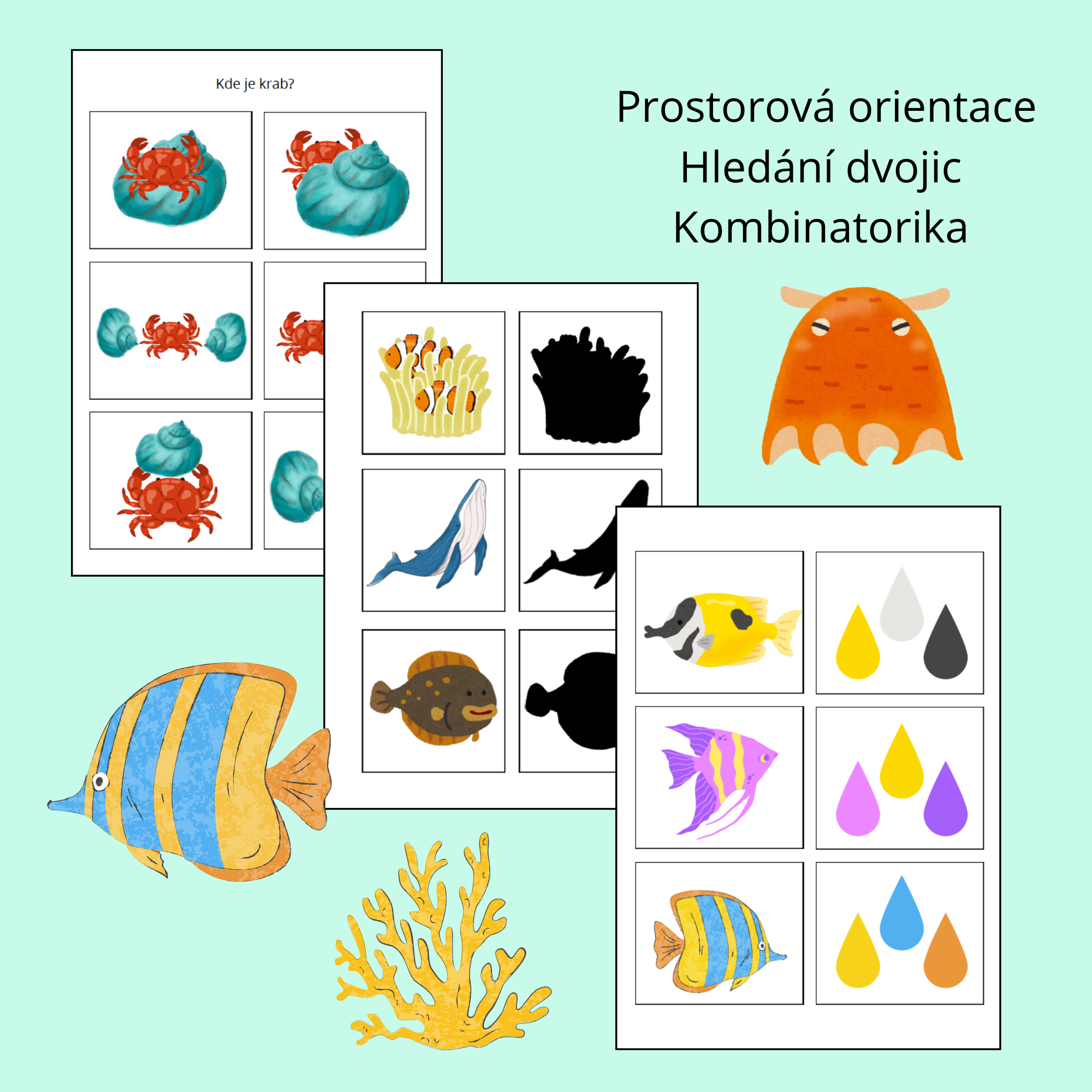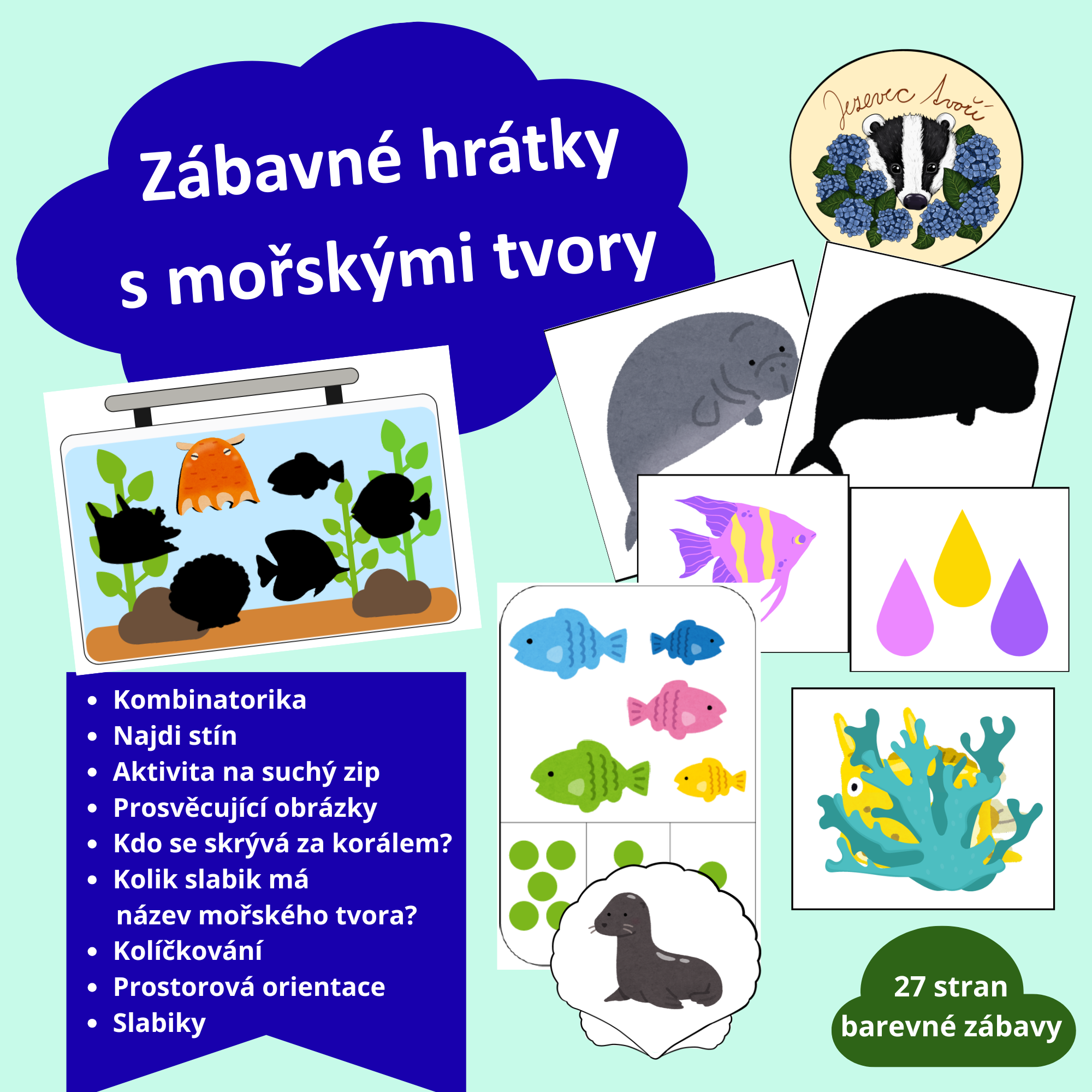 Soubor obsahuje 27 stran barevných úkolů namotivovaných mořskými tvory, jako jsou:
