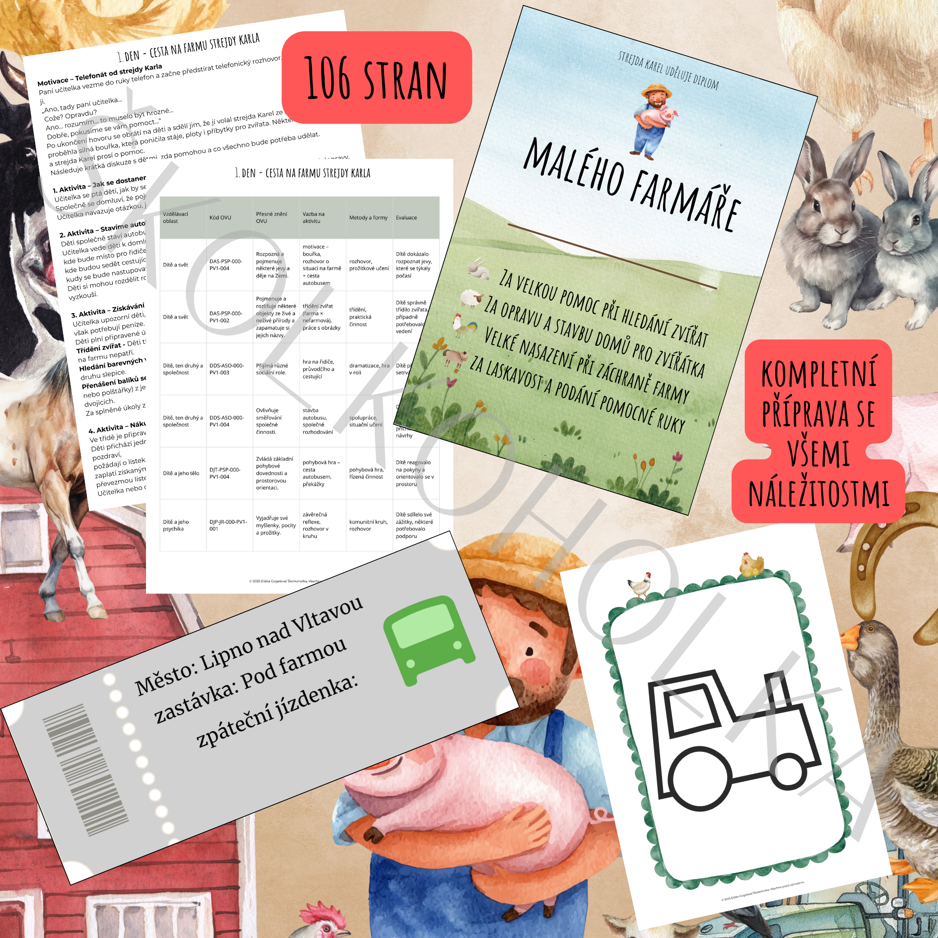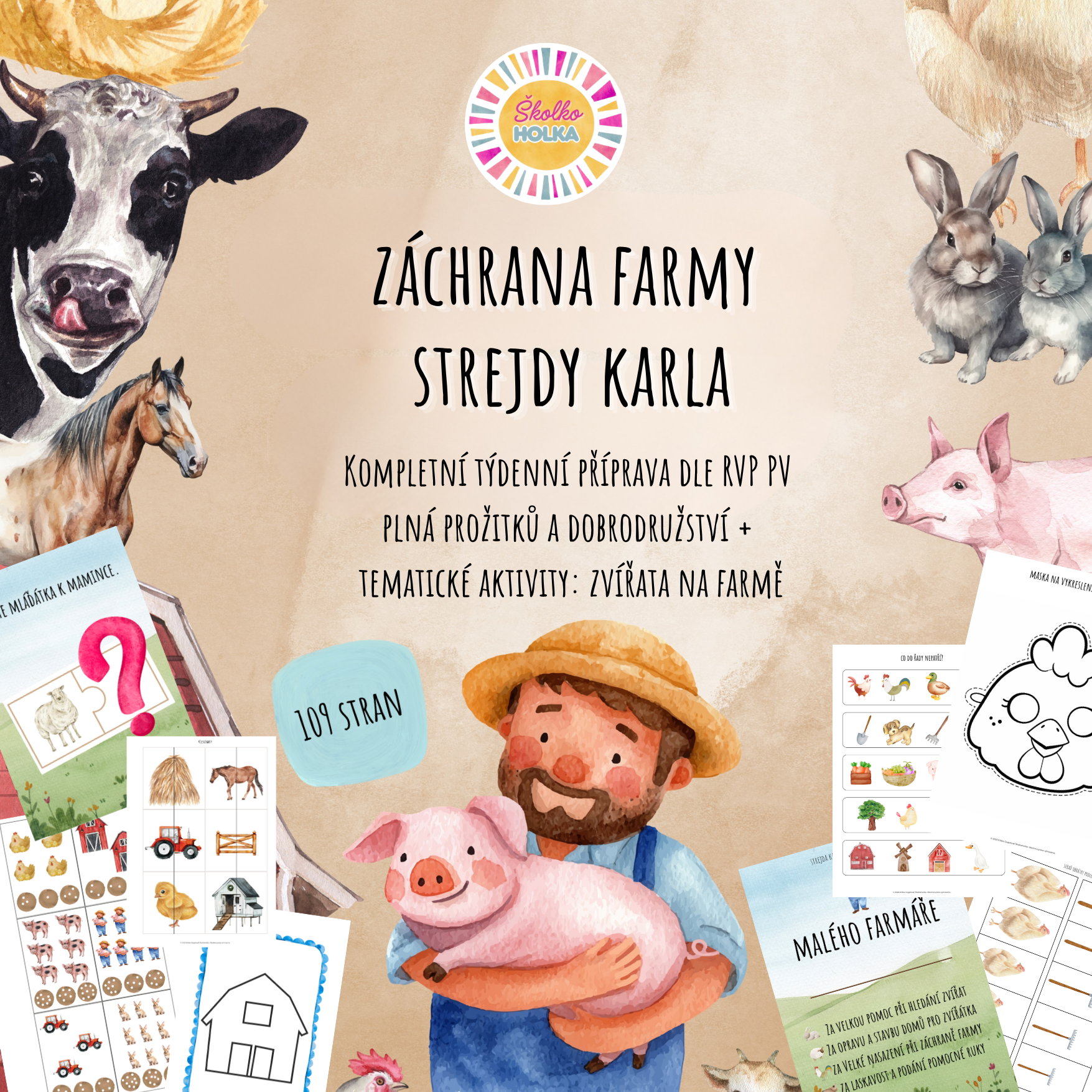 připravila jsem pro vás soubor (109 stran), ve kterém se děti nestávají jen pozorovateli, ale součástí příběhu. Společně se vydávají zachránit farmu strejdy Karla a během celého týdne ji postupně dávají do pořádku 🌾