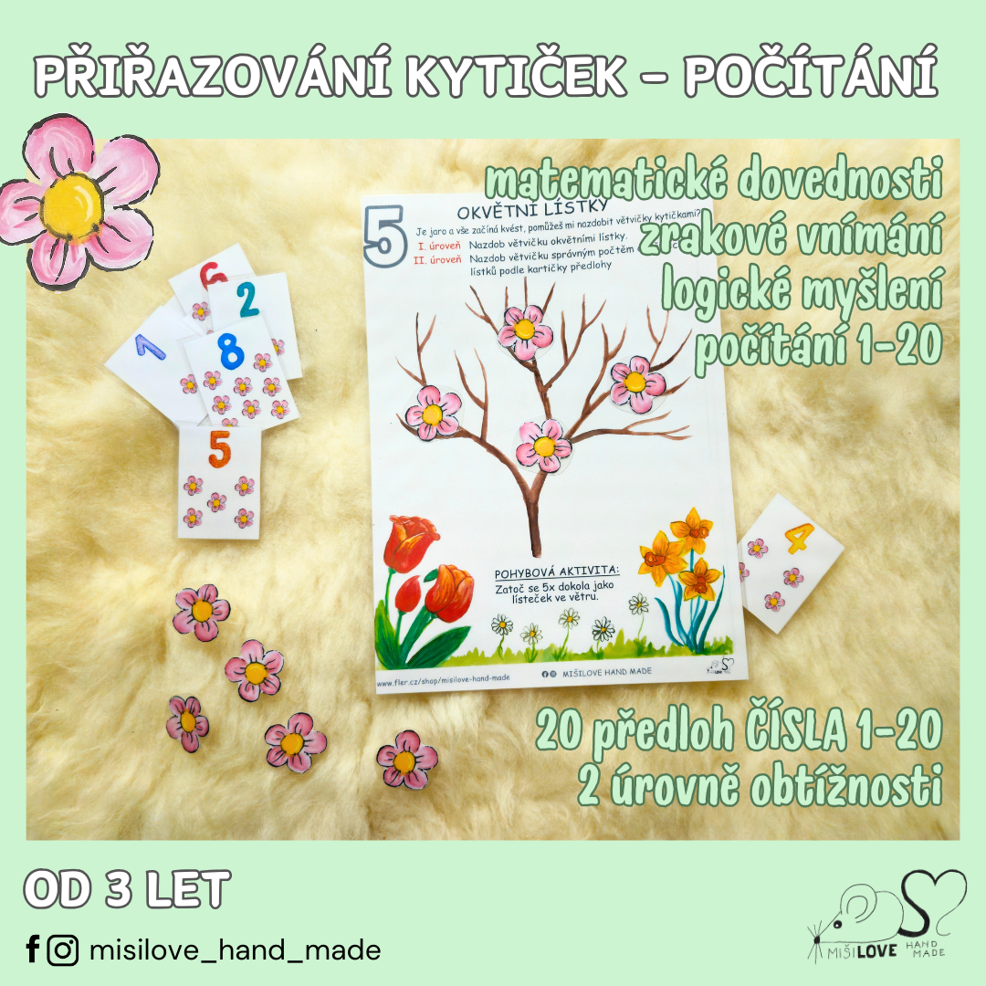 Tento pracovní list je určen k rozvoji jemné motoriky, vnímání počtu, pozornosti a schopnosti pracovat podle předlohy. Trénuje dovednost: kompetence k učení, kompetence k řešení problémů. Na podkladovém obrázku se nachází větvička, kde úkolem dětí je doplnit větvičku okvětními lístky. Buď si dítě větvičku jakkoliv nazdobí, nebo se drží předlohy - umístí počet kytiček, které ukazuje úkolová kartička s číslem.