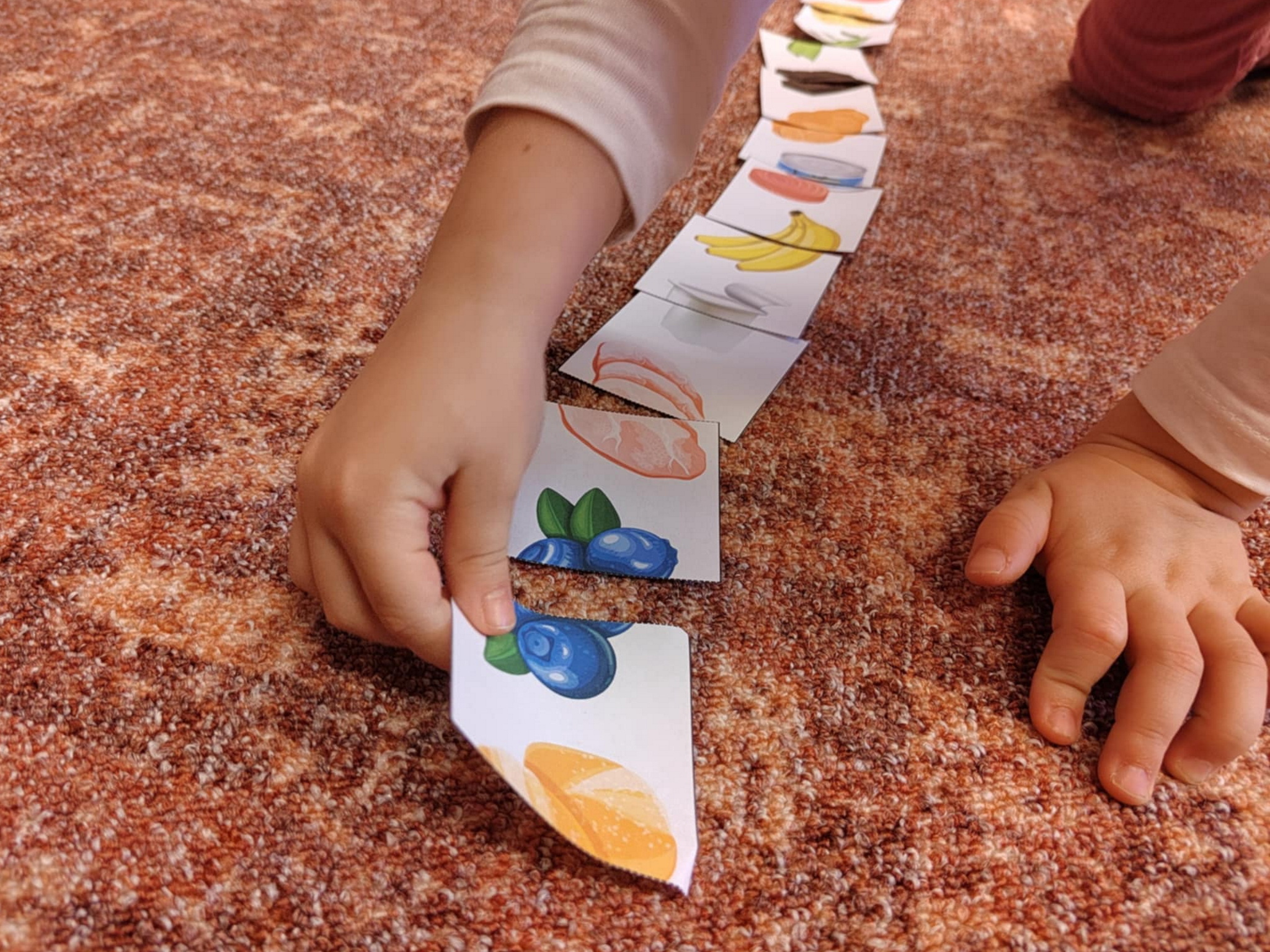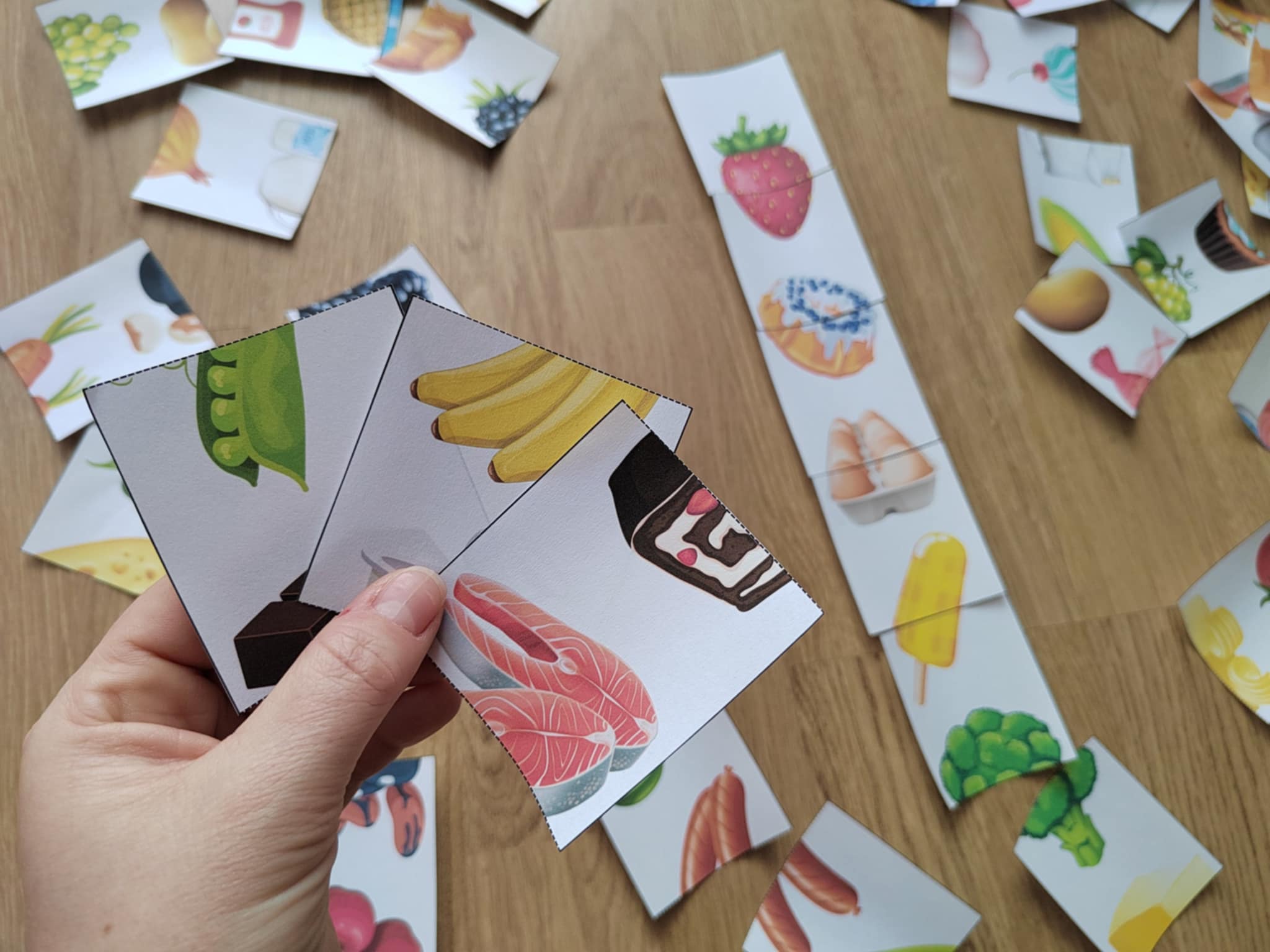 V PDF na děti čeká 48 kartiček s 2 polovinami obrázků, které musí spojit s dalšími kartičkami tak, aby vznikl jeden dlouhý "had". Dokáží to děti? A zvládnou poznat všechny vyobrazené potraviny?
