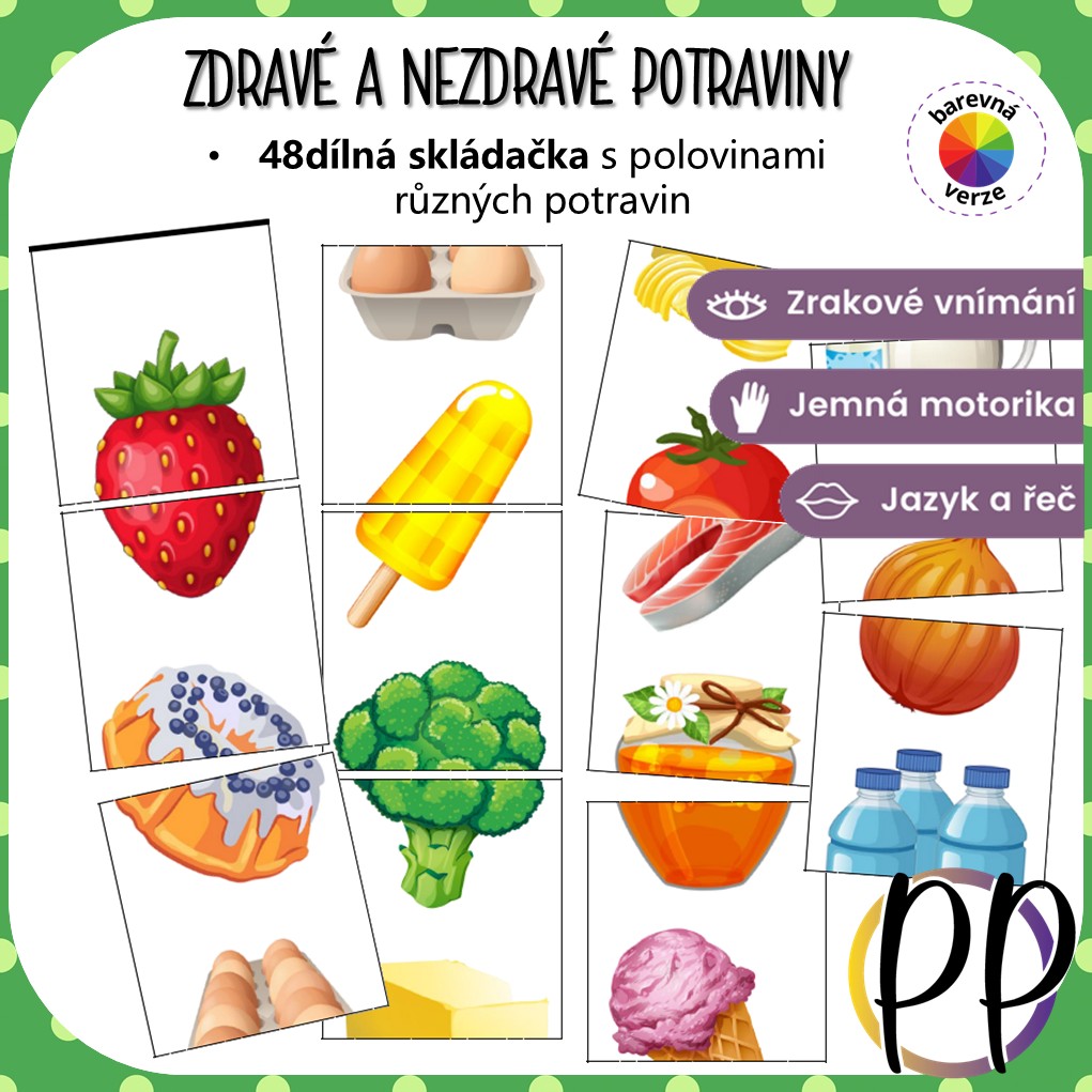 - skládačku se zdravými a nezdravými potravinami (48 kartiček ve velikosti 6,2 x 6,7 cm).
