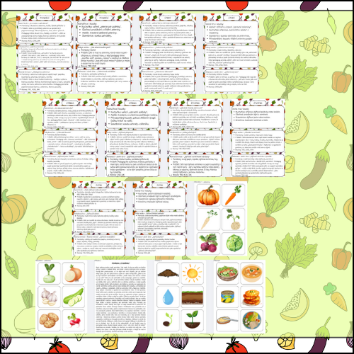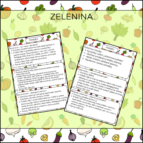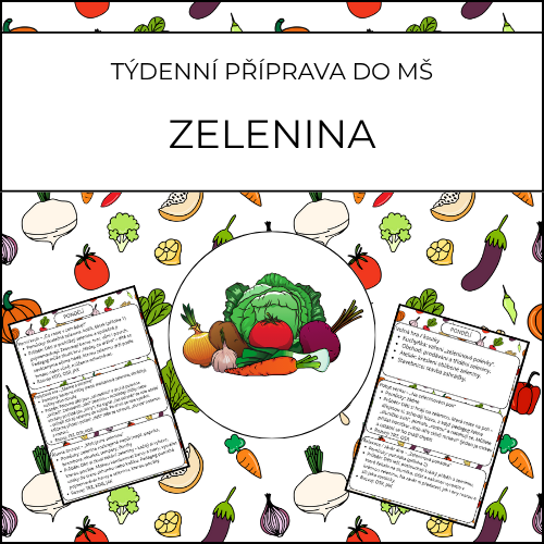 Podzimní zahrádka hraje všemi barvami – červená rajčata, oranžové mrkve, zelené okurky i fialové řepy. Tento digitální materiál „Zelenina“ vám nabídne ucelený program na celý týden, díky kterému děti hravou formou poznají různé druhy zeleniny, naučí se, kde roste, k čemu je důležitá a proč je zdravé ji jíst. Každý den přináší jiné objevování – smyslové hry, pohyb, tvoření i ochutnávky, které rozvíjejí všechny dětské smysly, poznání i vztah k přírodě.
