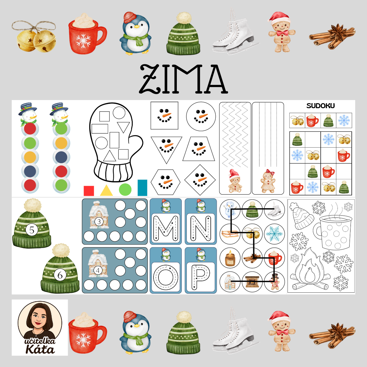 Skládačka sněhuláci (barvy), Rukavice tvary, Sněhuláci tvary, Předloha ke stříhání, Sudoku, Kolíčkovaná, Předloha písmena, Zimní bludiště, Omalovánky
