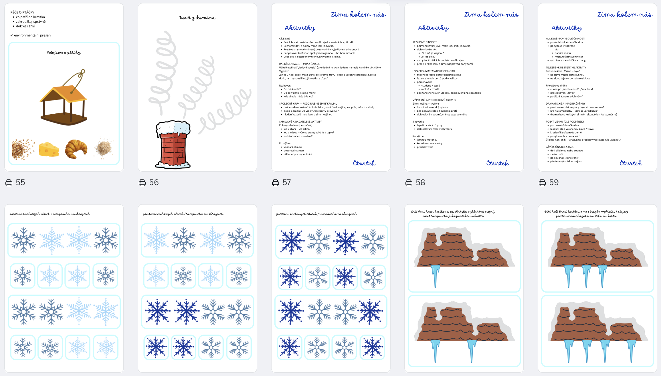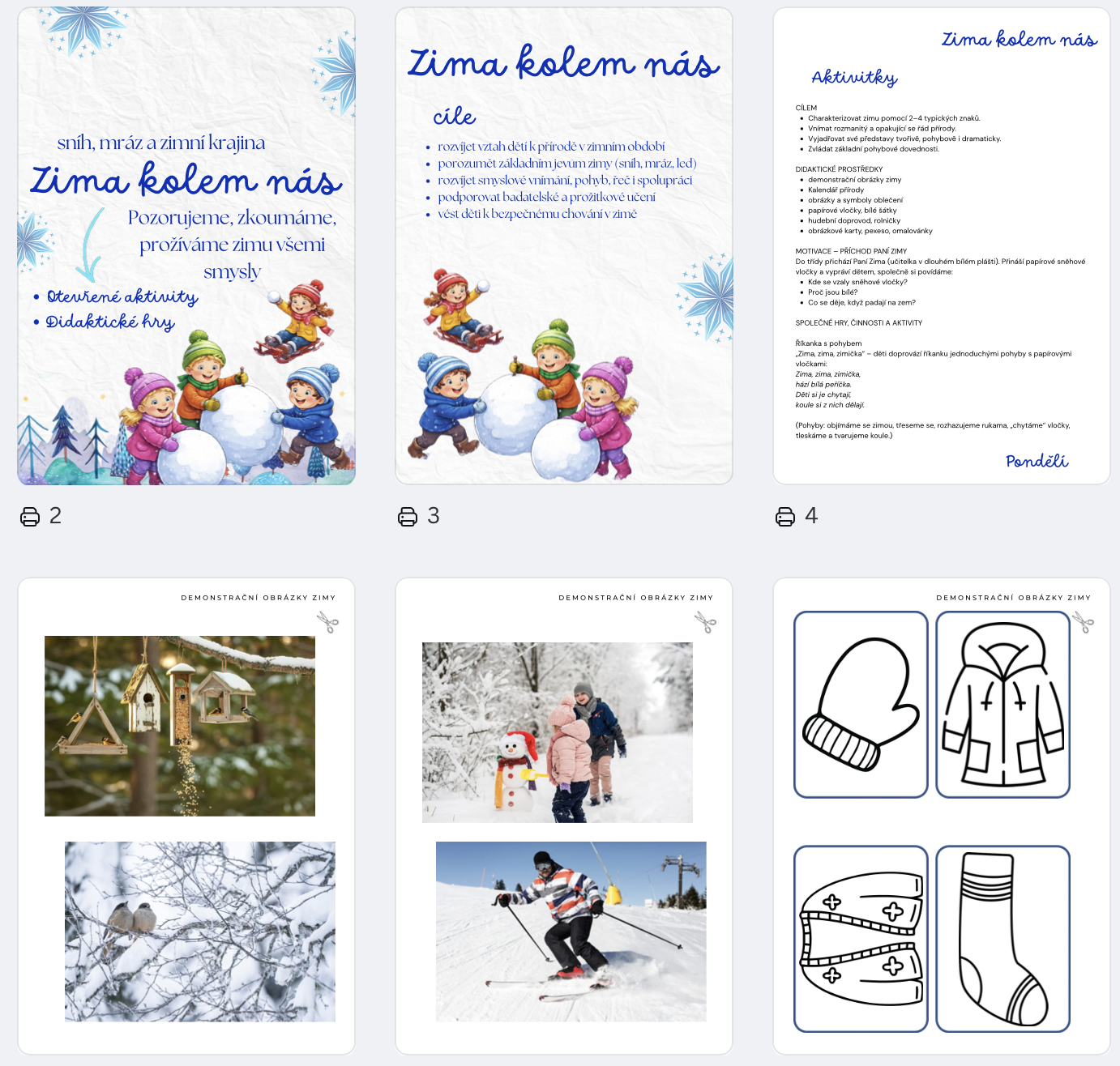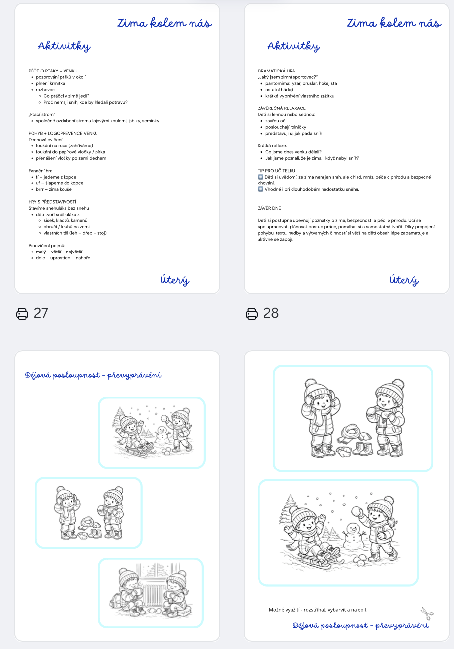 Soubor nabízí týdenní projekt (pondělí–pátek) s detailně rozpracovanými aktivitami, doplněný o pracovní listy, didaktické hry, demonstrační obrázky a náměty na tvoření i pohyb – se sněhem i bez sněhu.