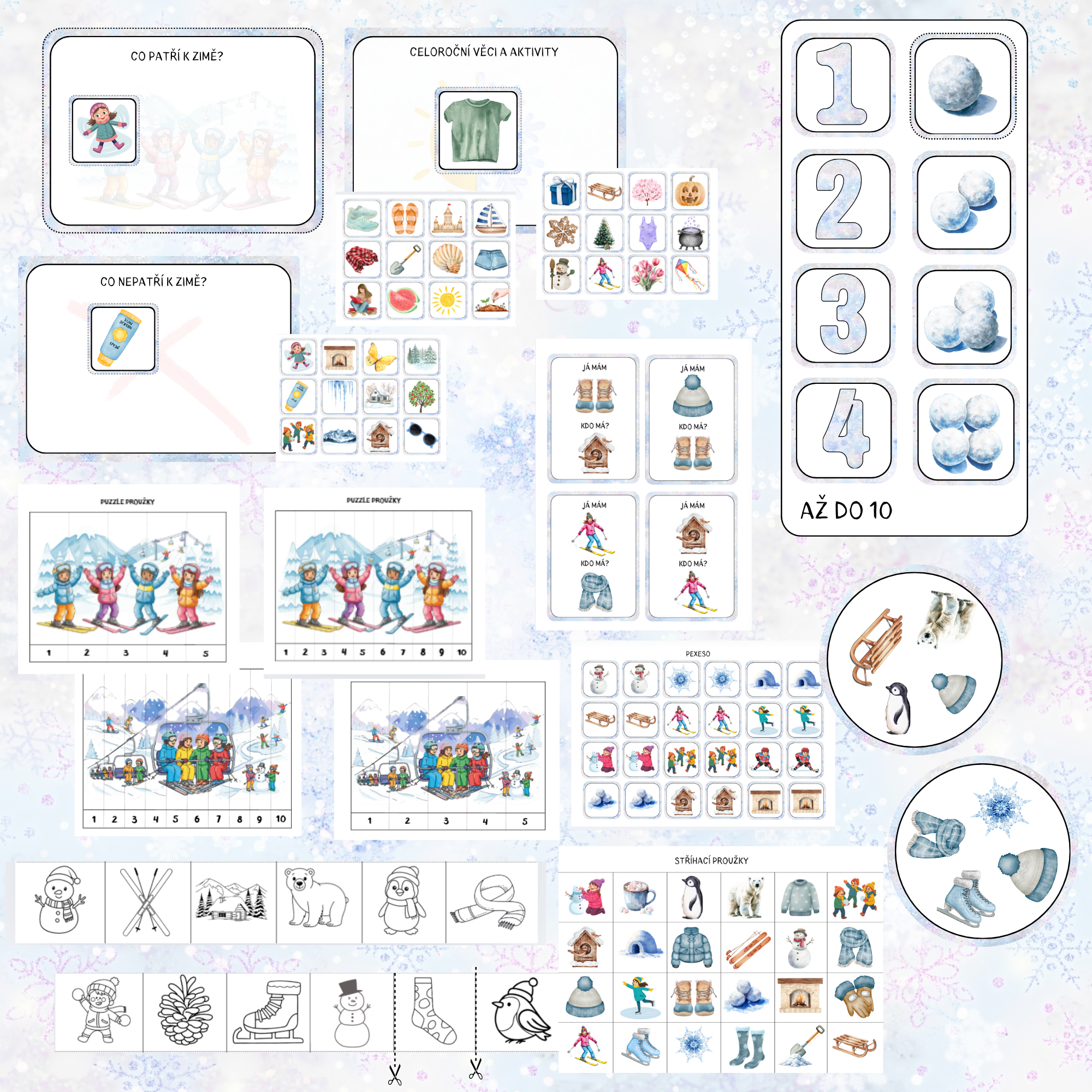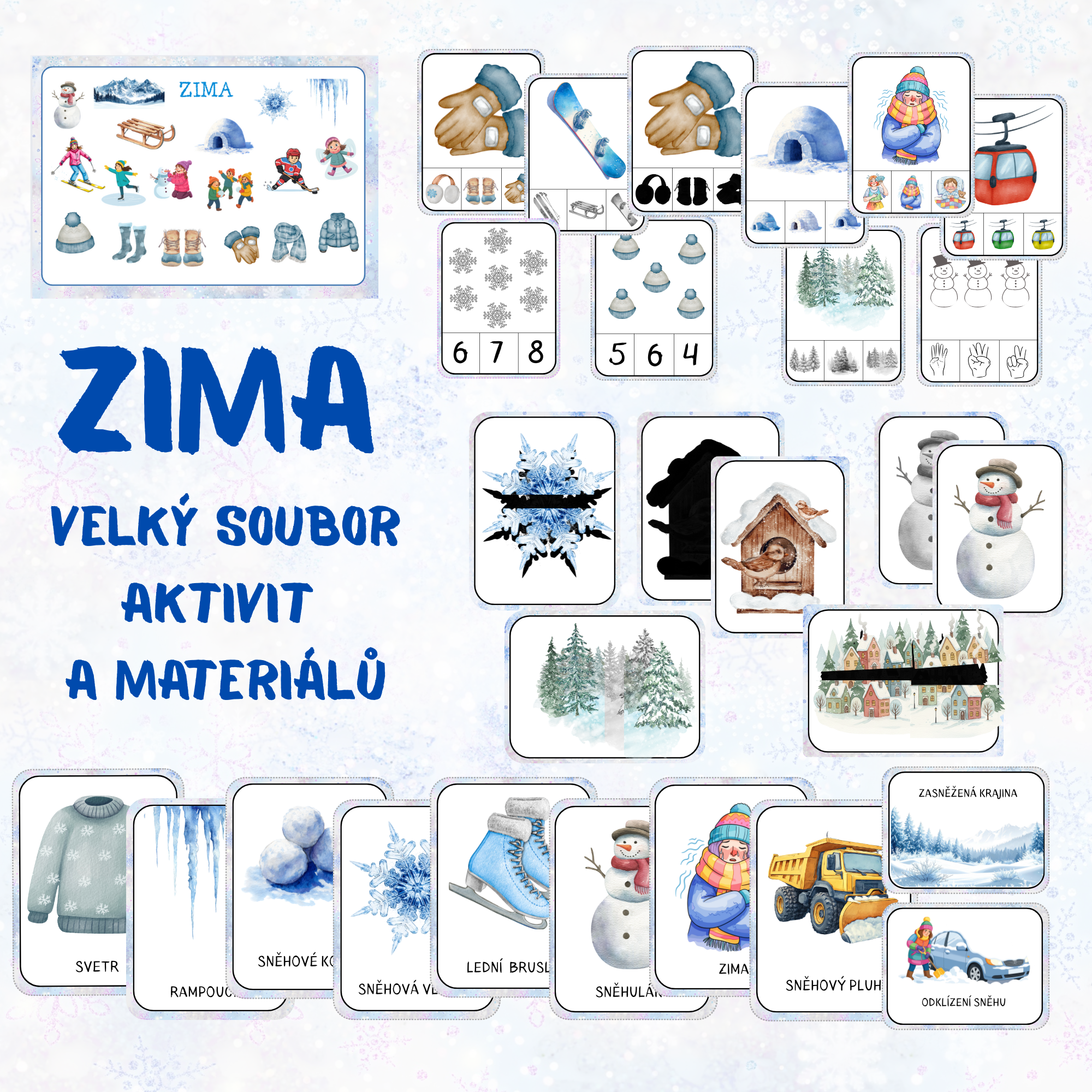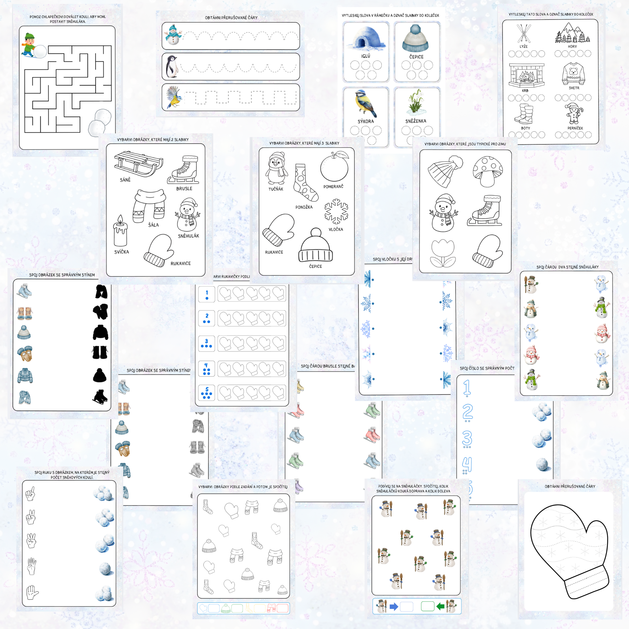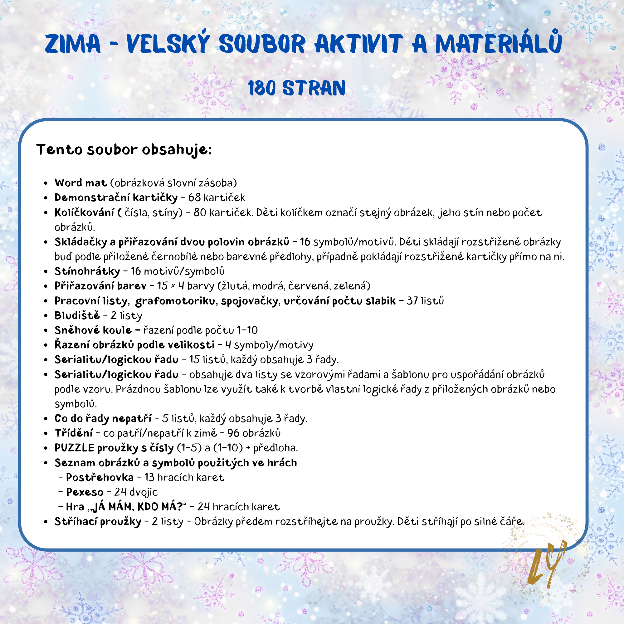 Zima – velký soubor aktivit a materiálů je rozsáhlý PDF balíček plný 180 stran vzdělávacích a zábavných aktivit pro děti. Najdete v něm pracovní listy, hry i tematické úkoly, které dětem zpříjemní zimní období a zároveň podpoří jejich rozvoj. Je ideální pro rodiče, učitelky a chůvy.