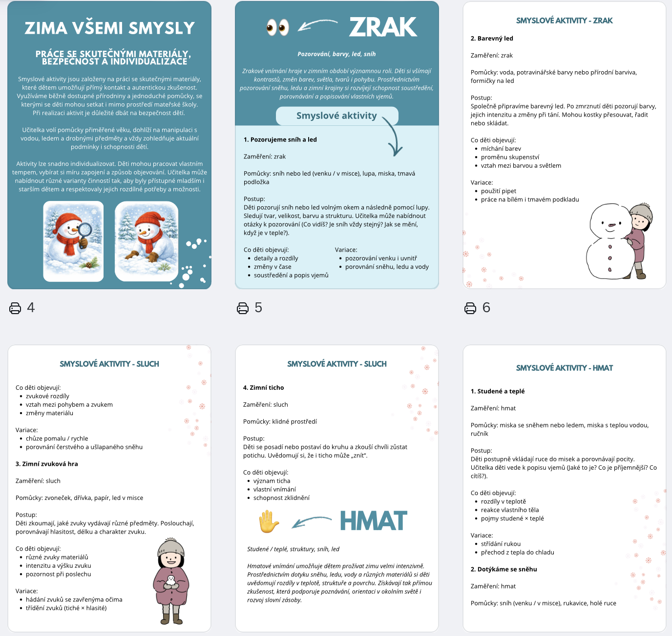 Tento soubor nabízí inspiraci pro práci s dětmi v zimním období tak, aby mohly zimu vidět, slyšet, cítit, dotýkat se jí a zkoumat ji vlastní zkušeností.