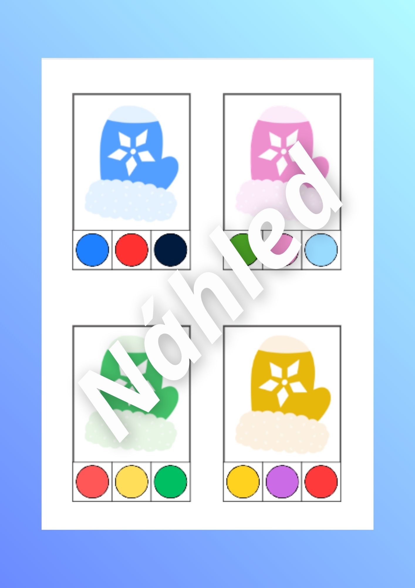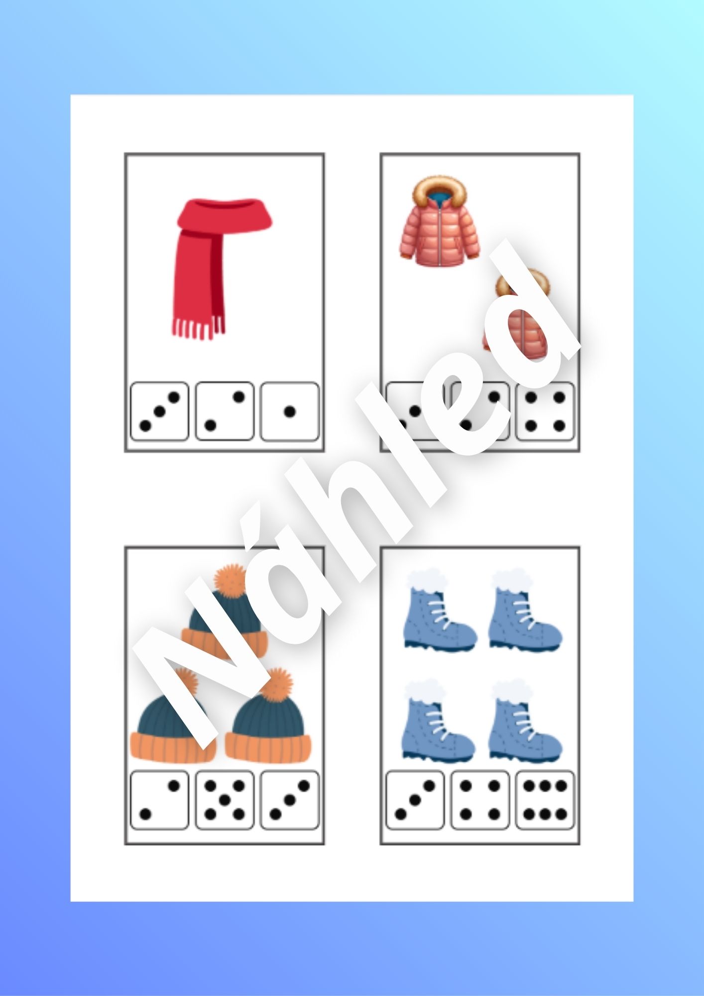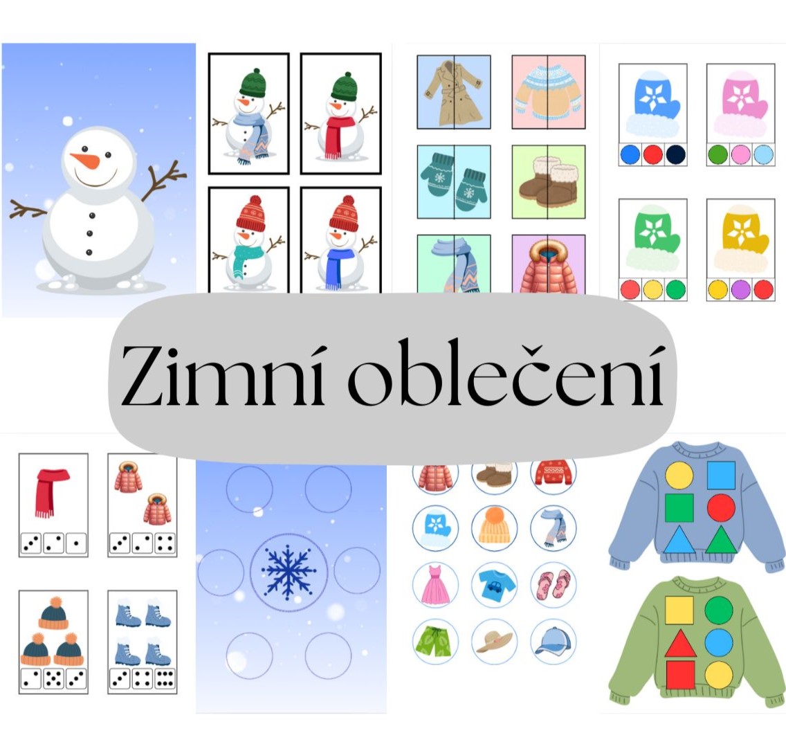 Tento vzdělávací materiál je zaměřen na zimní oblečení. Prostřednictvím hravých úkolů si děti rozvíjejí logické myšlení, zrakové vnímání, jemnou motoriku, předmatematické dovednosti, třídění a orientaci v barvách.