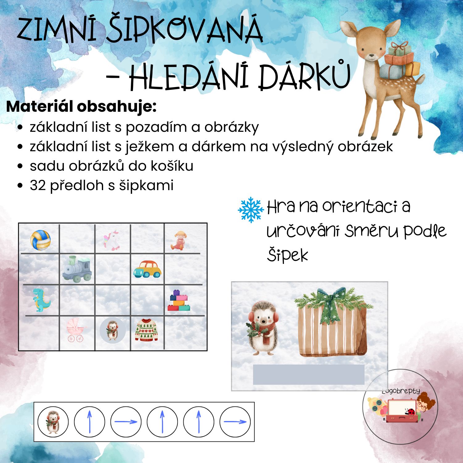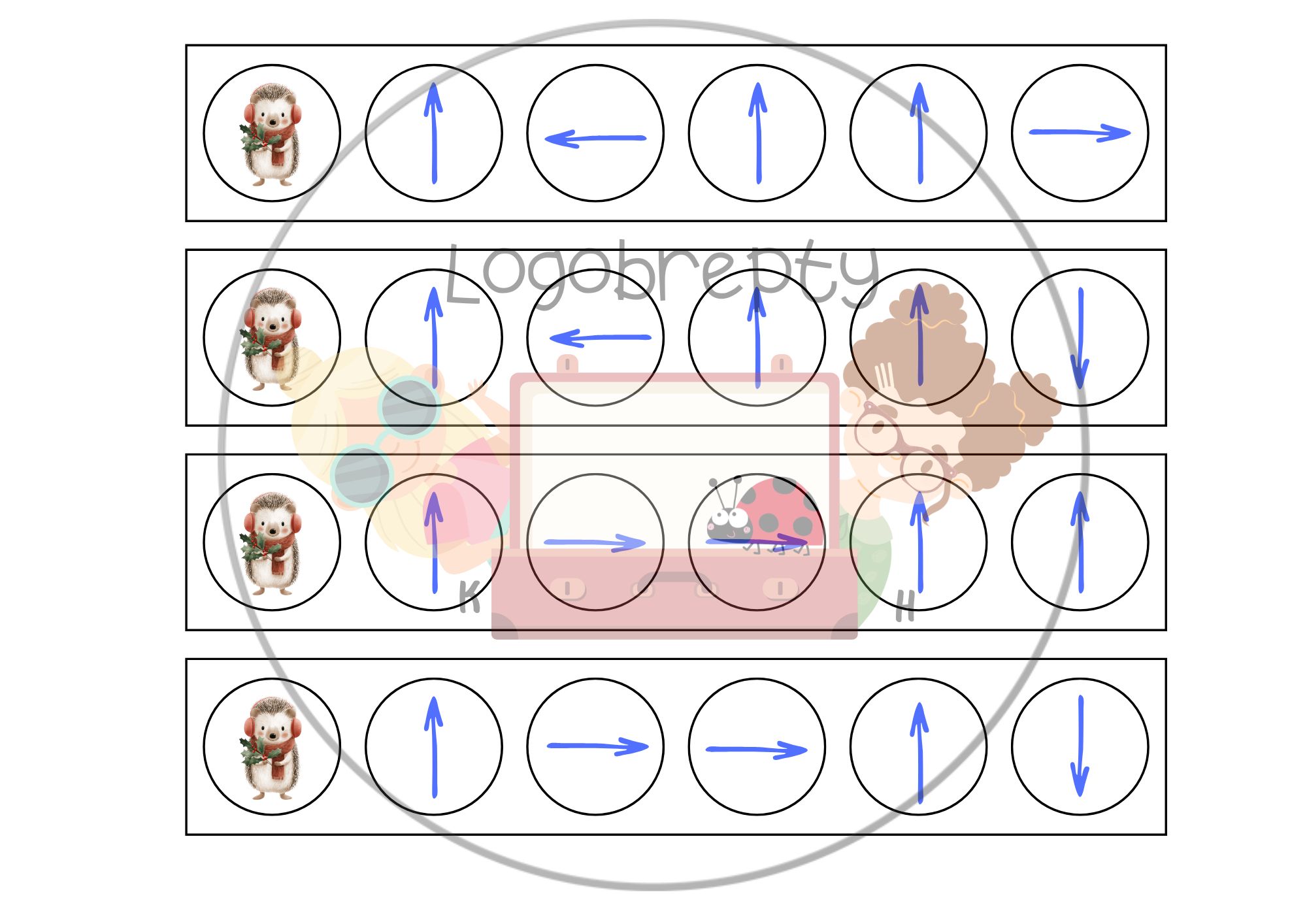 Tato pomůcka nabízí dětem hravou formu tréninku orientace v prostoru a práce podle jednoduchých instrukcí. Dítě vkládá proužek se směrovými šipkami do okénka u ježka, sleduje pokyny krok za krokem a pohybuje se po obrázkové mřížce. Podle cílového obrázku vybere správnou kartičku a přiloží ji k ježkovu dárku.