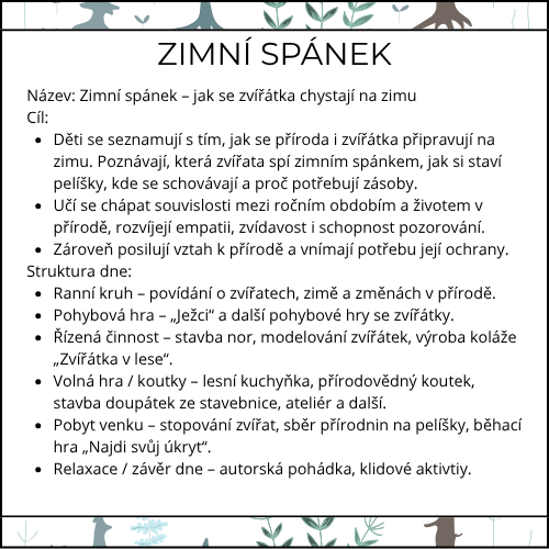 ✅ Ideální pro pozdní podzimní období – propojuje poznávání přírody, zvířat a ročních proměn formou pohybu, tvoření, smyslového vnímání i klidného prožitku.