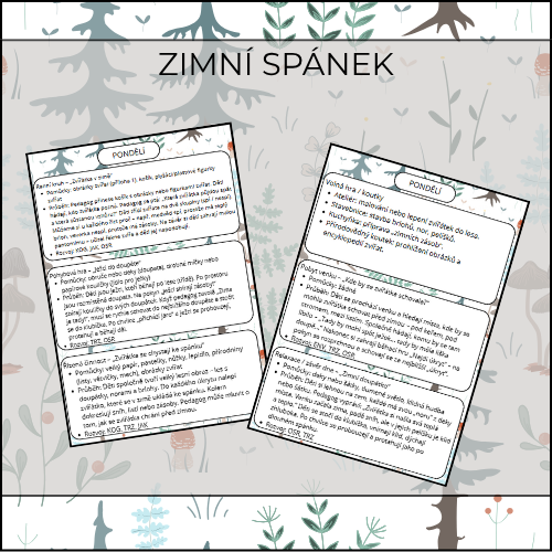 Když se dny zkracují a vzduch voní listím, les se pomalu chystá k odpočinku. Malý ježek si staví pelíšek z listí, medvěd hledá teplé doupě a liška se schoulí do klubíčka. Tento digitální materiál „Zimní spánek“ vás provede týdnem plným her, tvoření a objevování, během kterého se děti seznámí s tím, jak se příroda i zvířátka připravují na zimu. Každý den přináší nové poznání – pohyb, pozorování, smyslové aktivity i klidné chvilky, které dětem pomohou porozumět proměnám přírody a životu v lese.