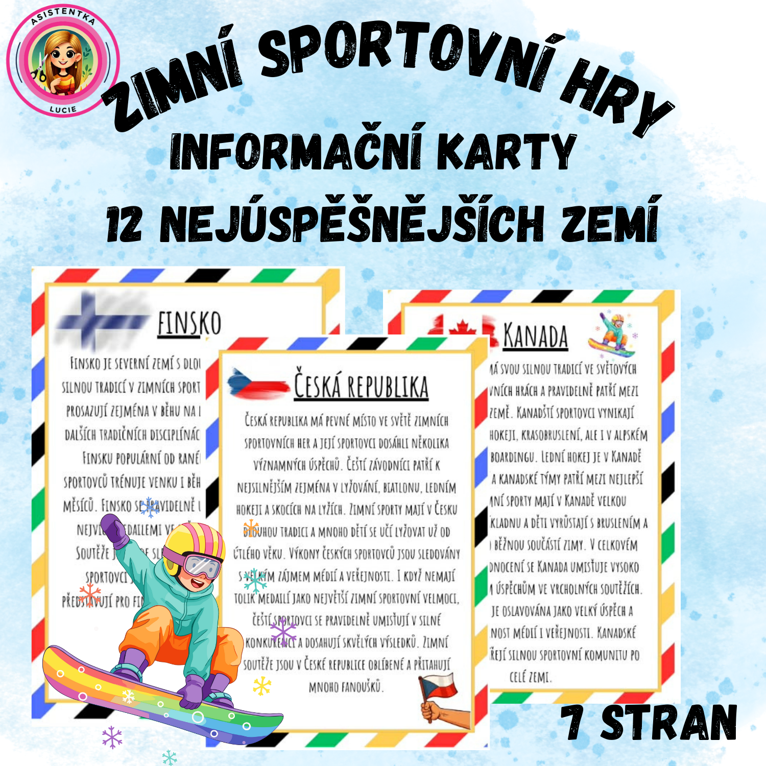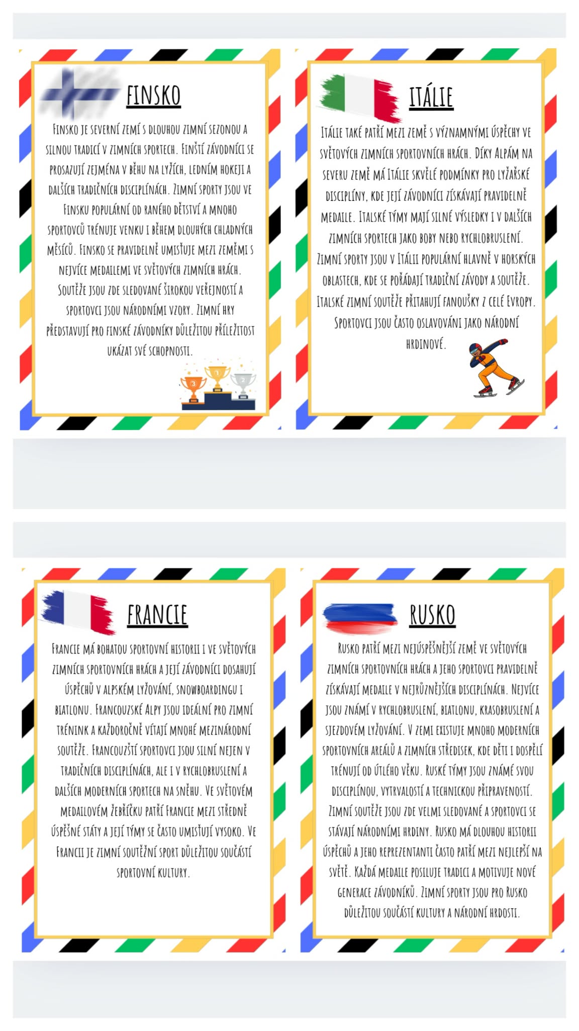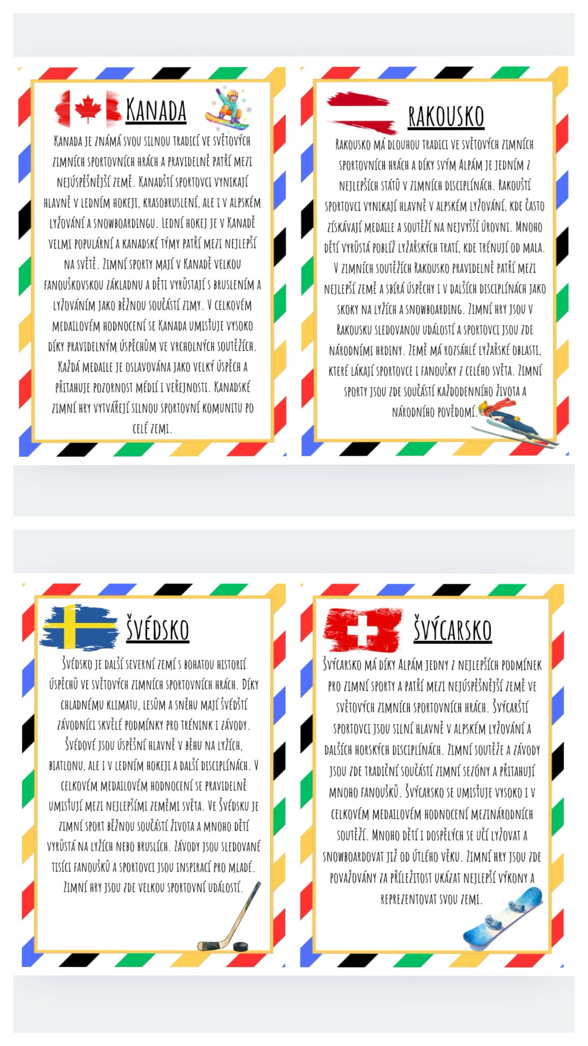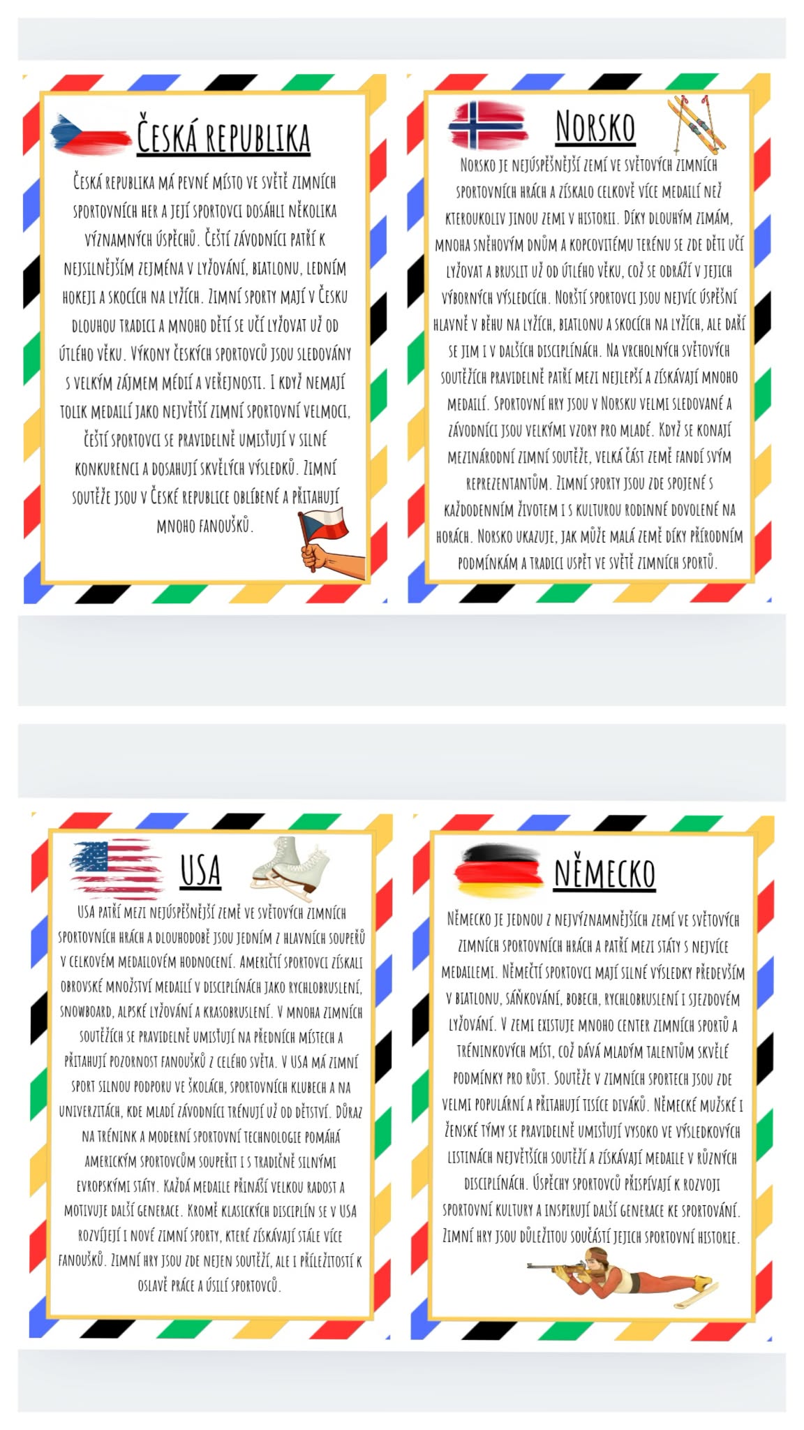 - Tento materiál obsahuje soubor informačních karet o nejúspěšnějších zemích ve světových zimních sportovních hrách. Každá karta představuje jednu z vybraných zemí, její typické zimní sporty, úspěchy sportovců. Texty jsou psané tak, aby byly čtivé pro žáky 2.–5. třídy a zároveň přehledné, aby je bylo možné použít jako výzdobu třídy nebo nástěnky.