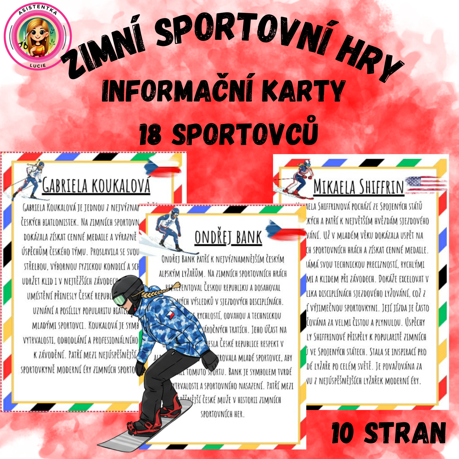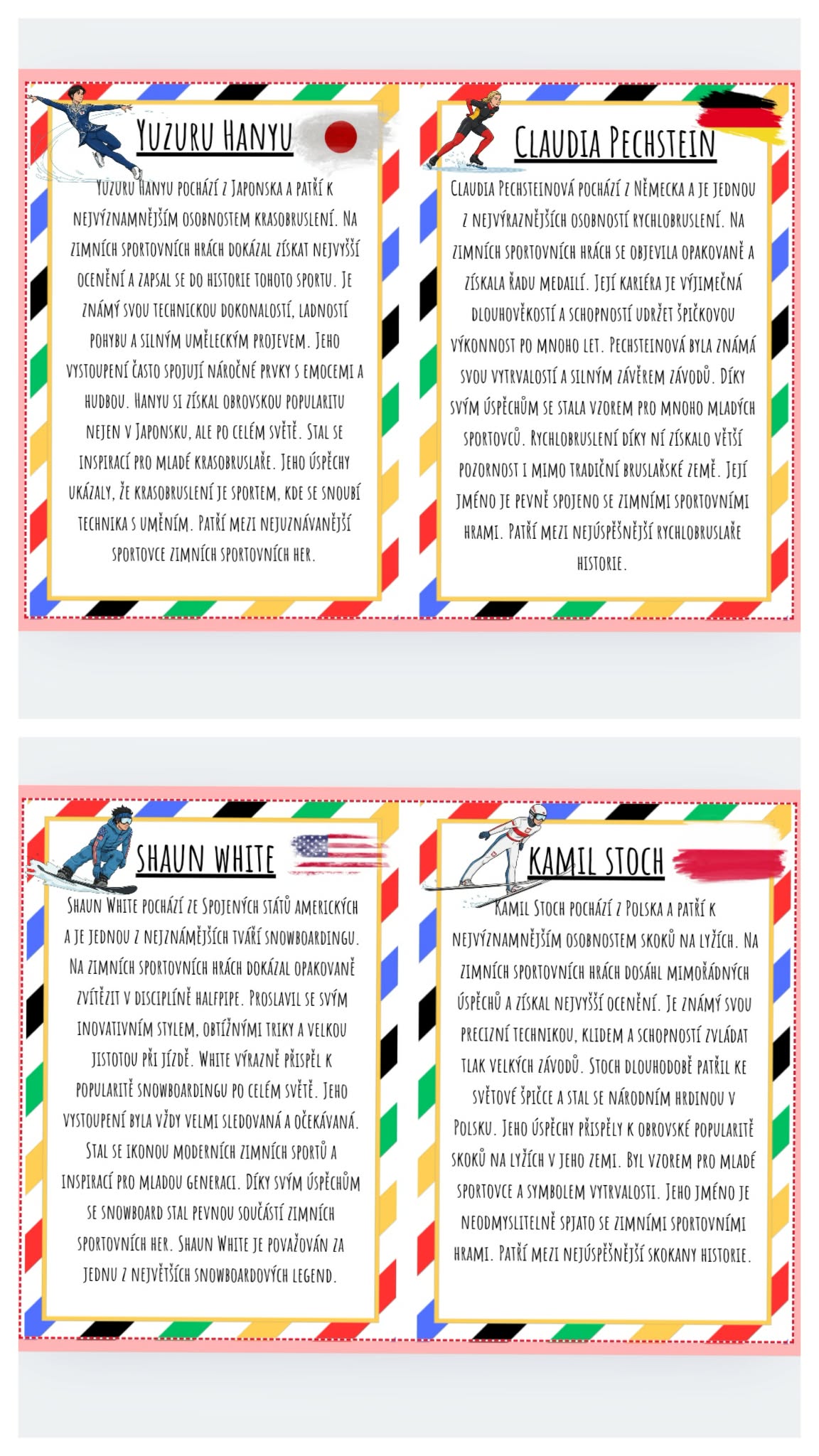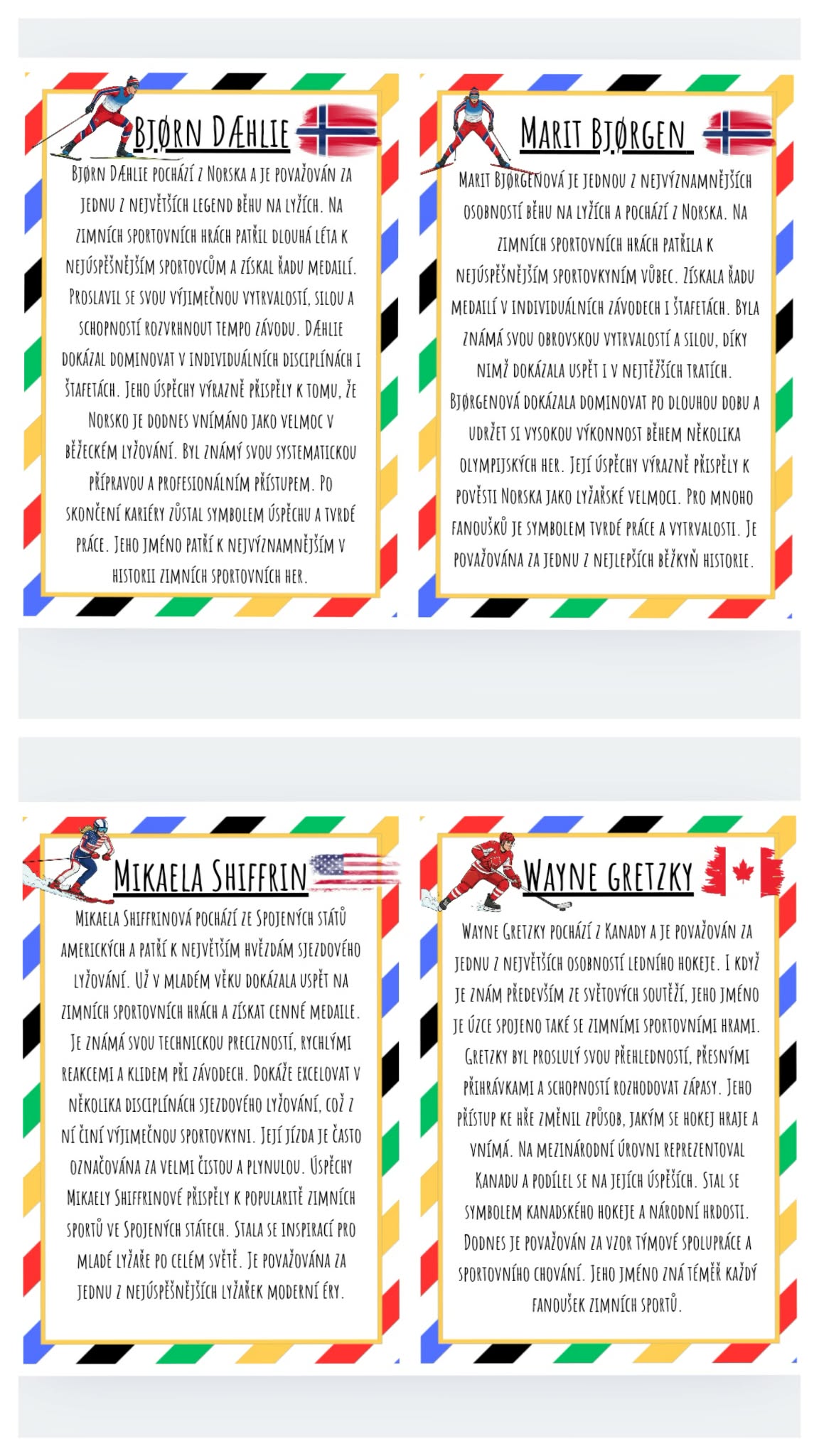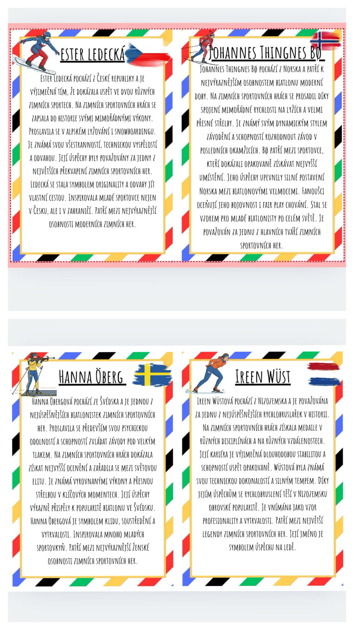 Tento materiál obsahuje sadu informačních karet o nejslavnějších a nejúspěšnějších sportovcích zimních sportovních her. Každá karta představuje jednoho sportovce a stručně informuje o jeho úspěších, sportovní disciplíně a významu pro zemi, kterou reprezentuje. Materiál je určen především k edukativnímu a poznávacímu účelu, zároveň může sloužit jako výzdoba třídy nebo herny.