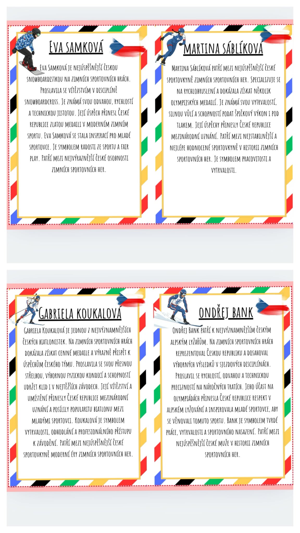 - Karty lze využít i pro didaktické hry: přiřazování disciplín, zemí nebo medailí.
