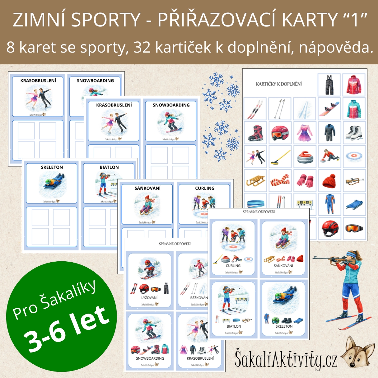 Výuková sada Zimní sporty a potřeby – přiřazování od ŠakalíAktivity.cz pomáhá dětem poznat zimní sporty a pochopit, jaké vybavení je pro jednotlivé disciplíny nezbytné. Aktivita je vhodná pro mateřské školy, 1. stupeň základních škol i domácí vzdělávání.