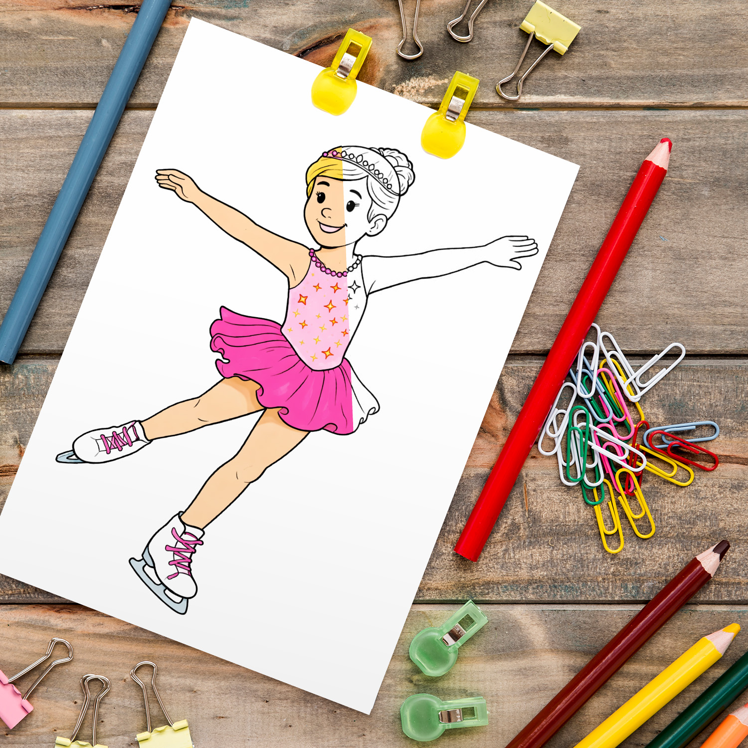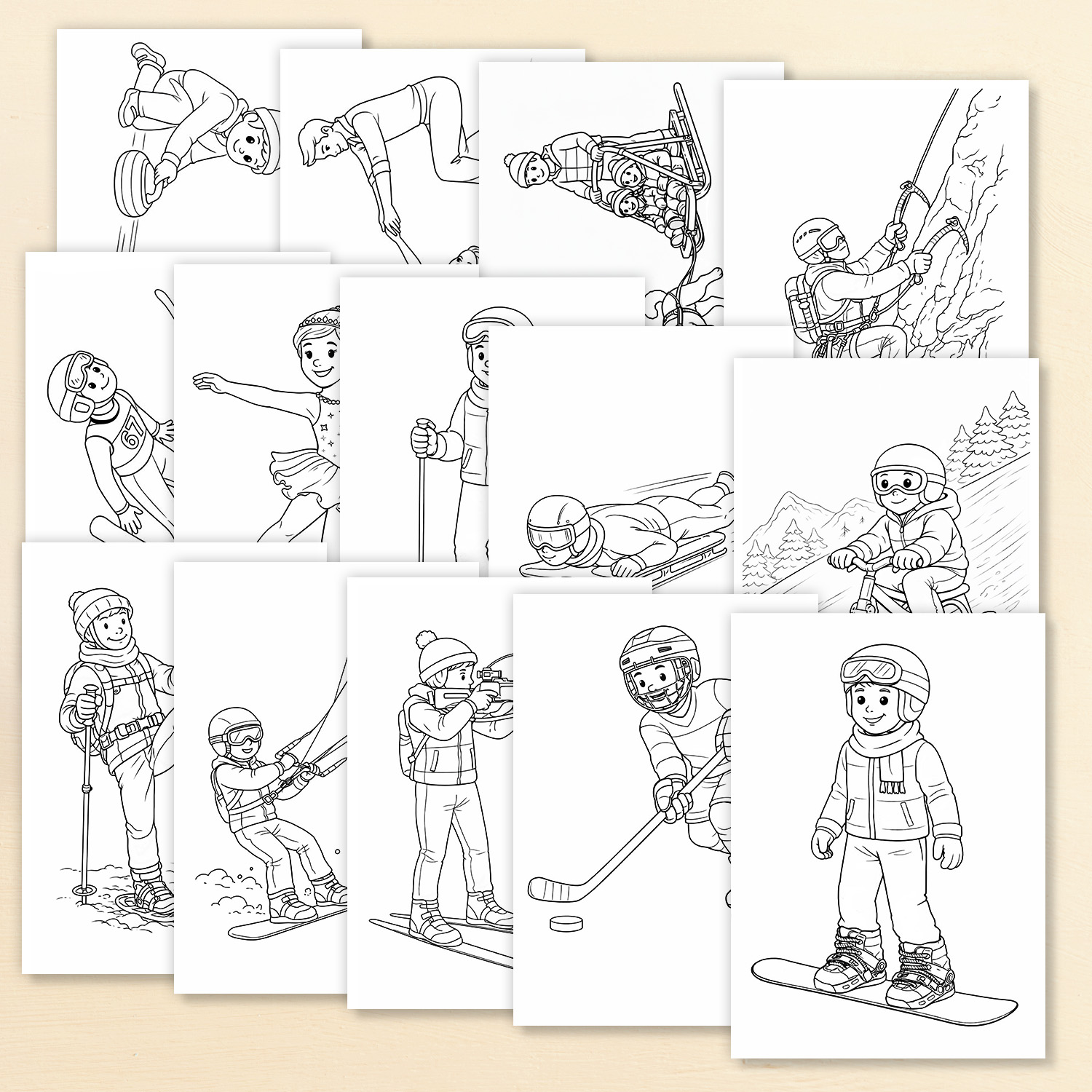 Omalovánky zachycují klidné a srozumitelné scény jednotlivých sportů, jako je lyžování, bruslení a krasobruslení, lední hokej, snowboarding, skoky na lyžích, jízda na bobech a skibobu i další zimní aktivity. Vše je zpracováno v jednotném stylu s čistými černobílými liniemi, vhodnými pro děti různých věkových kategorií.