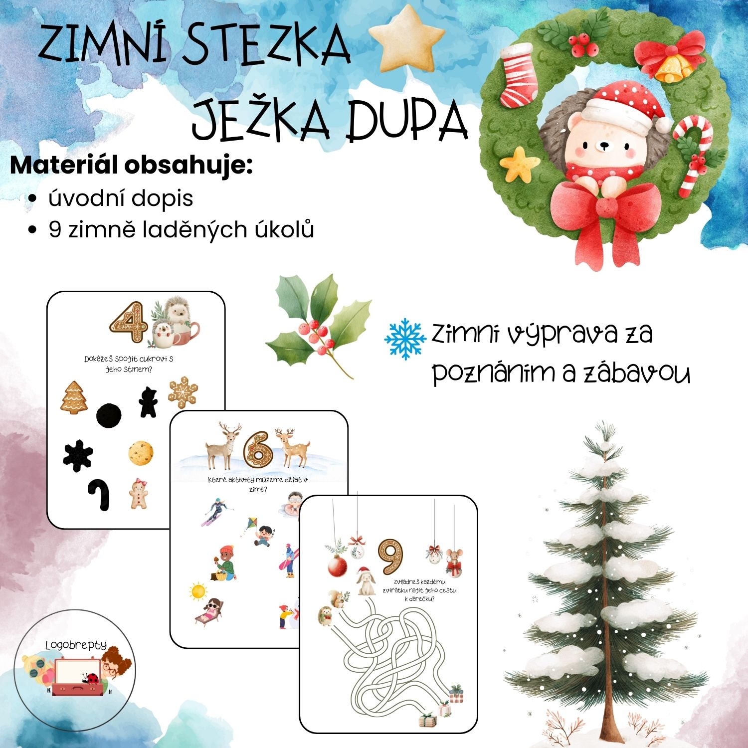 Zimní stezka ježka Dupa dětem nabízí dobrodružnou cestu plnou zimních úkolů. Aktivita začíná společným přečtením dopisu od ježka, který děti provede celou stezkou a motivuje je k hledání jednotlivých stanovišť. Kartičky s úkoly můžete rozmístit kdekoliv – ve třídě, na chodbě nebo venku na školní zahradě.