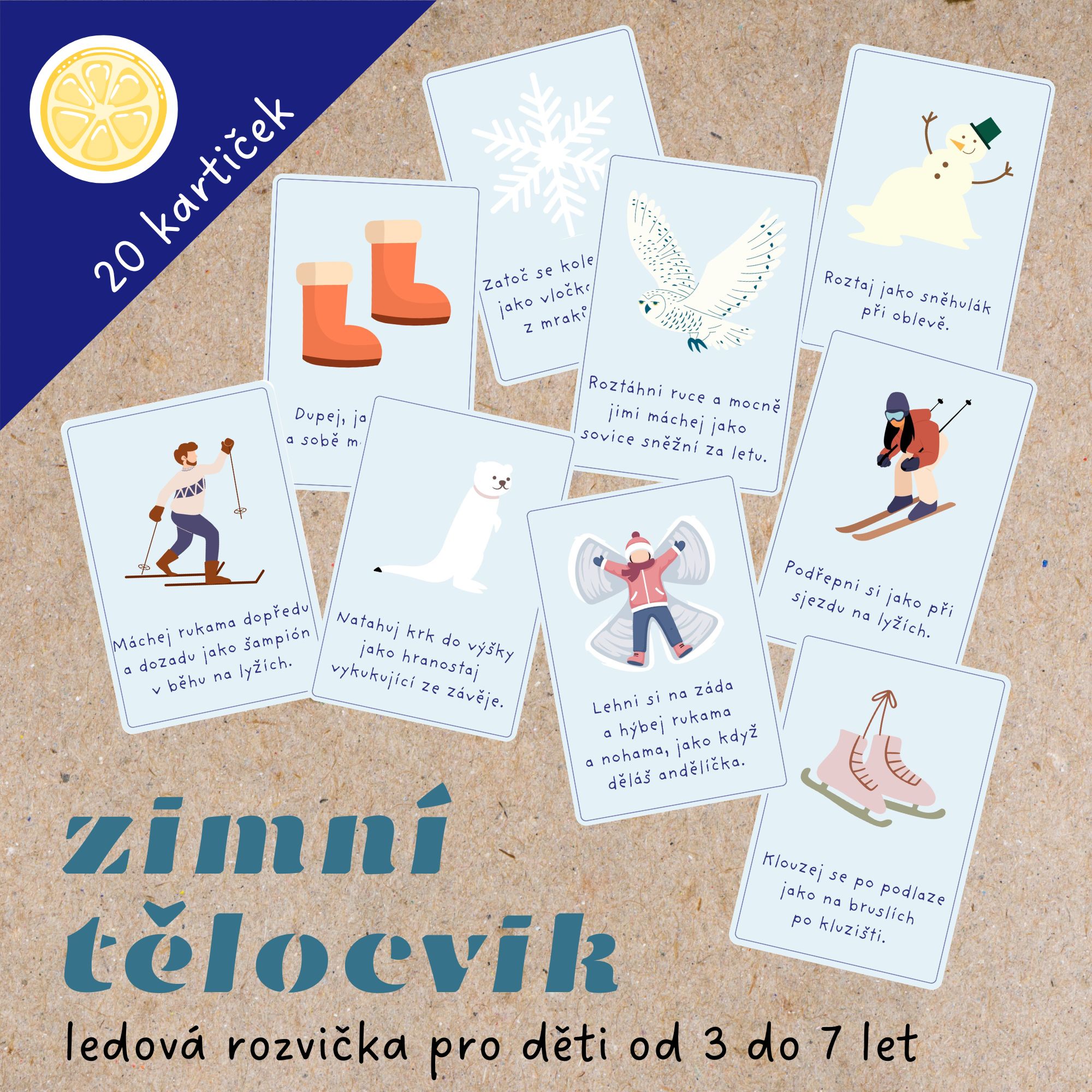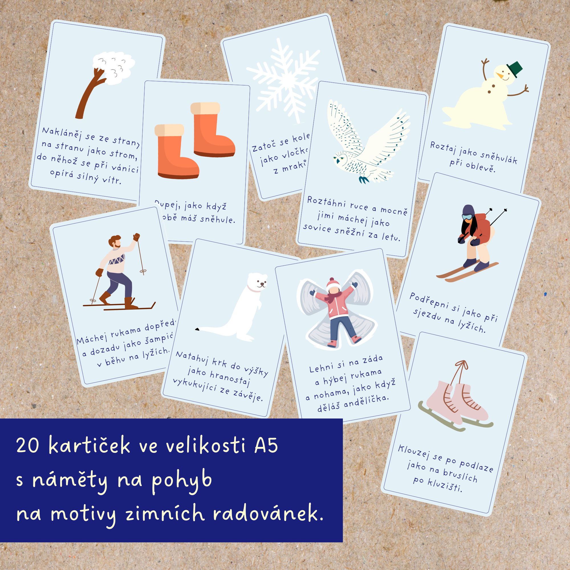 ❄️V balíčku najdete 20 obrázkových karet s náměty na pohyby inspirované zimou. Cílem je zpestřit si všední dny zábavným pohybem v době, kdy se nedá tolik běhat venku.