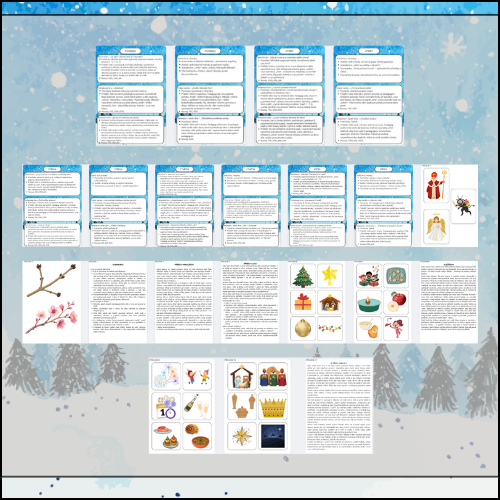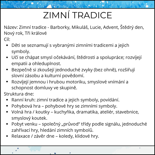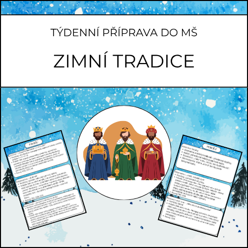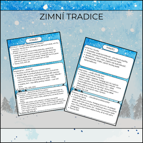 Když se brzy stmívá, na parapetu čeká Barborčina větvička a třídou cinkne rolnička, přichází čas zimních tradic. Děti si je bezpečně a srozumitelně vyzkouší – od Barborek a Mikuláše přes Lucii a advent až po Nový rok a Tři krále. Digitální materiál „Zimní tradice“ přináší ucelený týden aktivit: jasné ranní kruhy, přehledné běhačky pro velkou třídu, hezké výrobky, jednoduchý pobyt venku i klidné závěry dne bez zbytečných tisků navíc.