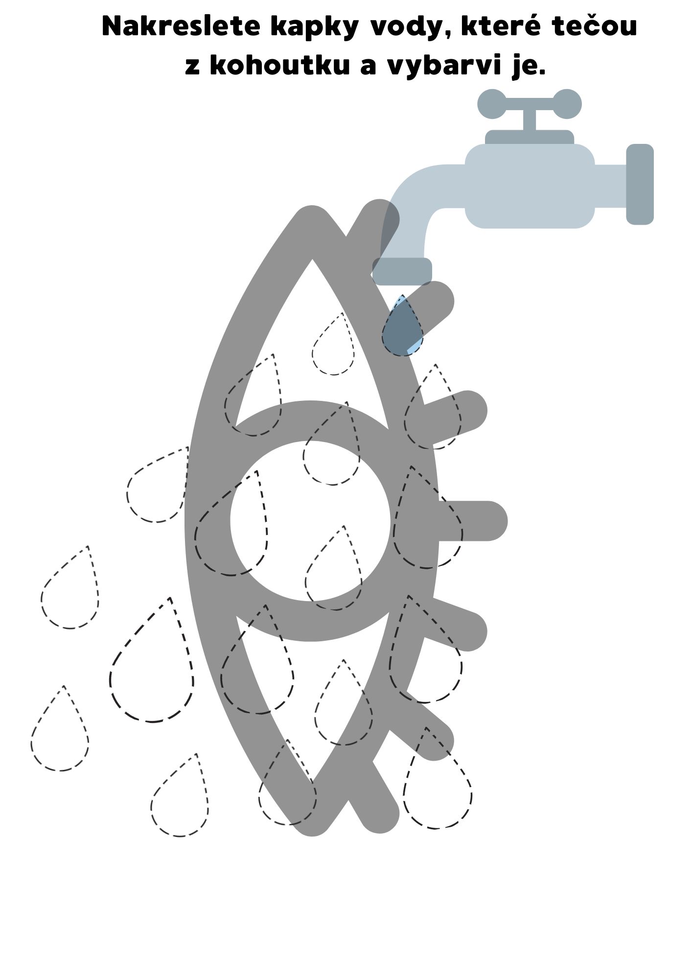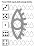 Součástí materiálu je průvodní list s cíli a zaměřením, otázky do komunikativního kruhu podporující rozvoj slovní zásoby a vyjadřování, demonstrační obrázky (např. moře, řeka, rybník, potok) a básnička „Kap, kap, kap“. Pracovní listy rozvíjejí grafomotoriku, zrakové vnímání i matematické představy (spojování kapek, stíny, počítání podle kostky, koloběh vody, přiřazování obrázků, vybarvování, stříhání).