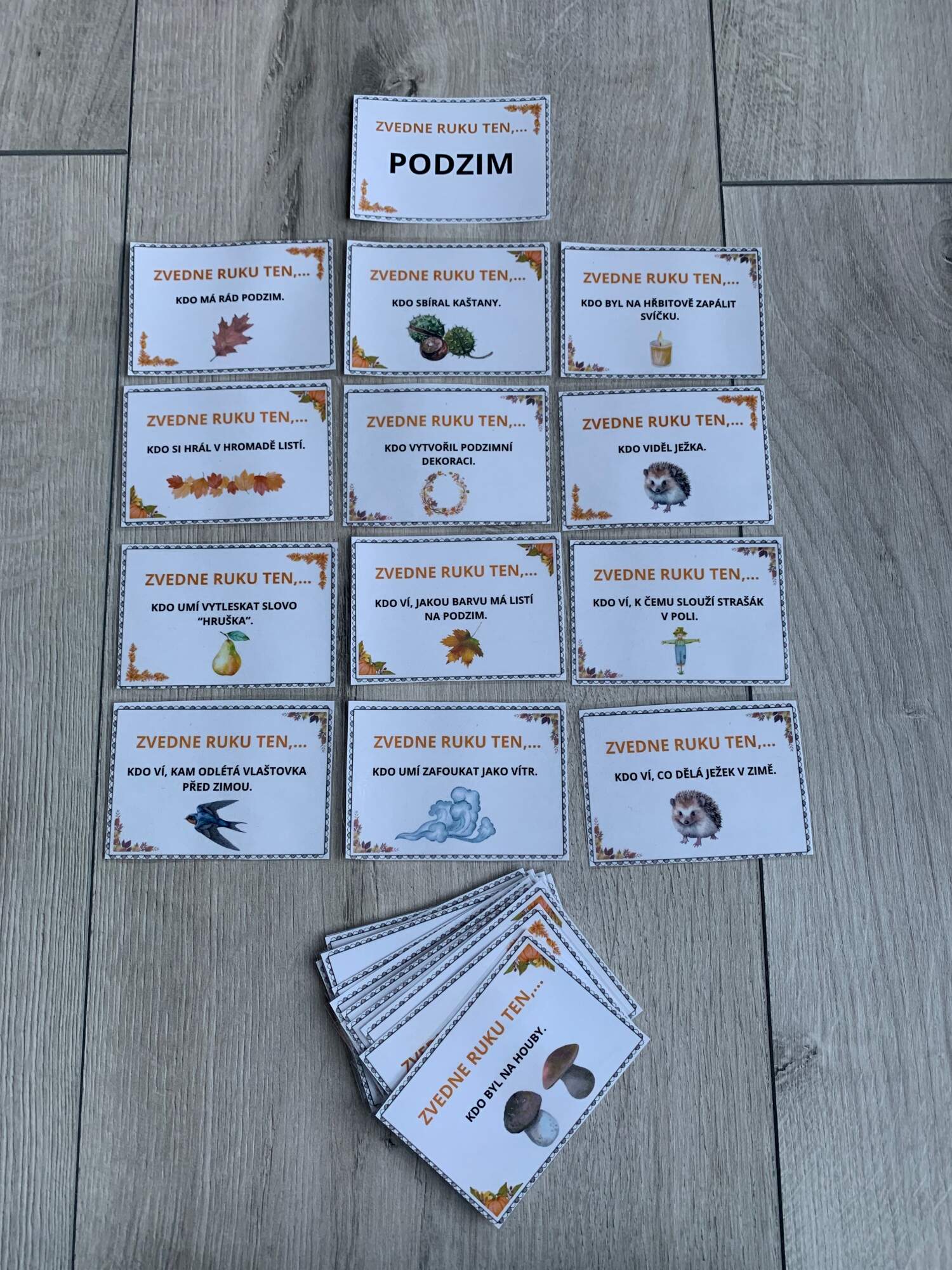 Učitelka čte dětem kartičky např. Zvedne ruku ten, kdo upekl jablkový závin. Úkolem dětí je na znamení souhlasu reagovat zvednutím ruky.