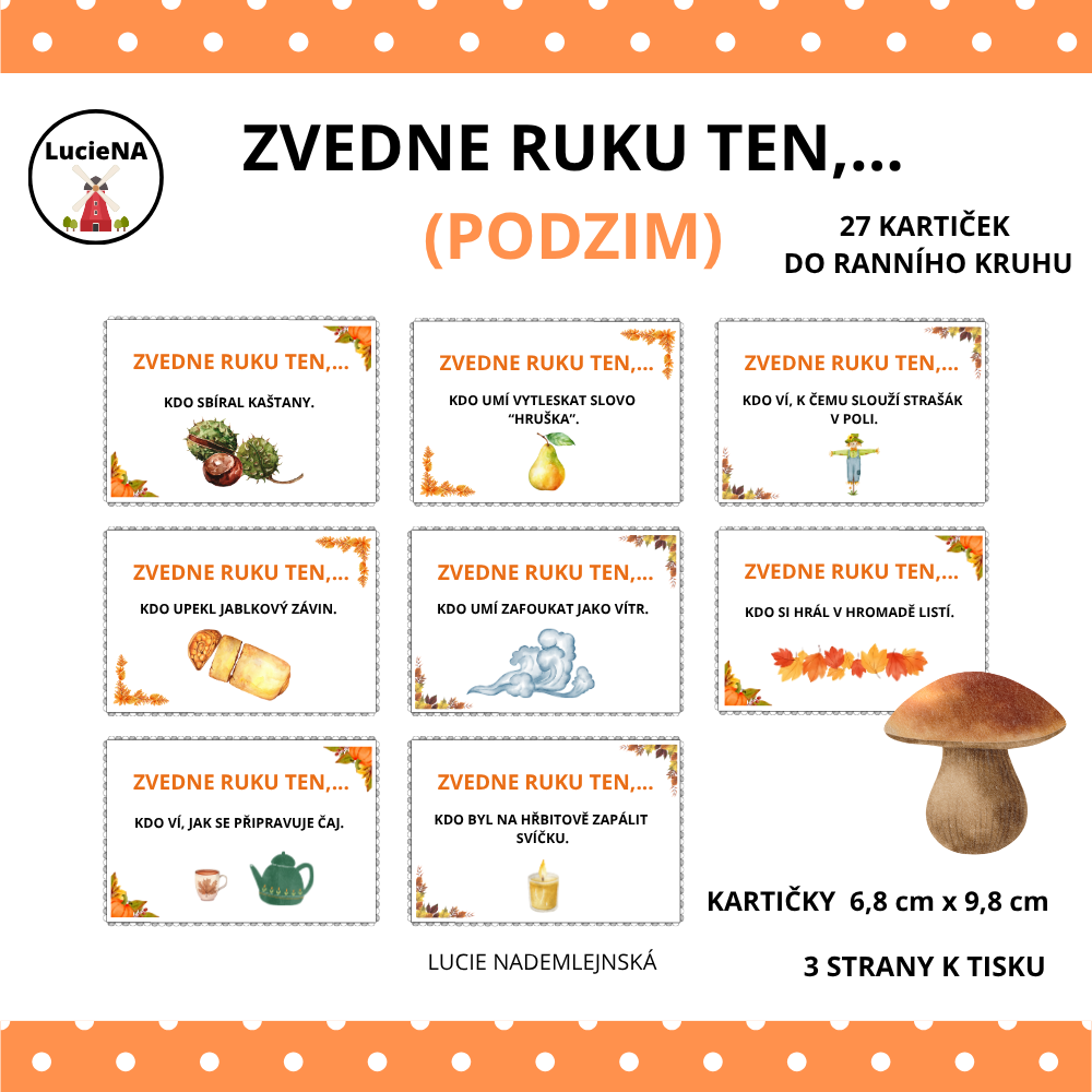 Učitelka může dětem klást doplňující otázky k jednotlivým kartičkám. Např. S kým jsi pekl/a závin? Kde jsi sbíral/a jablka? Znáš nějaké další ovoce, které dozrává na podzim? apod.