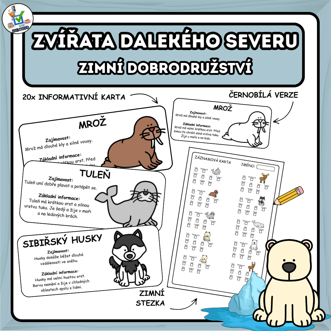 Výukový materiál je zaměřený na poznávání zvířat dalekého severu formou informačních karet a zimní stezky.